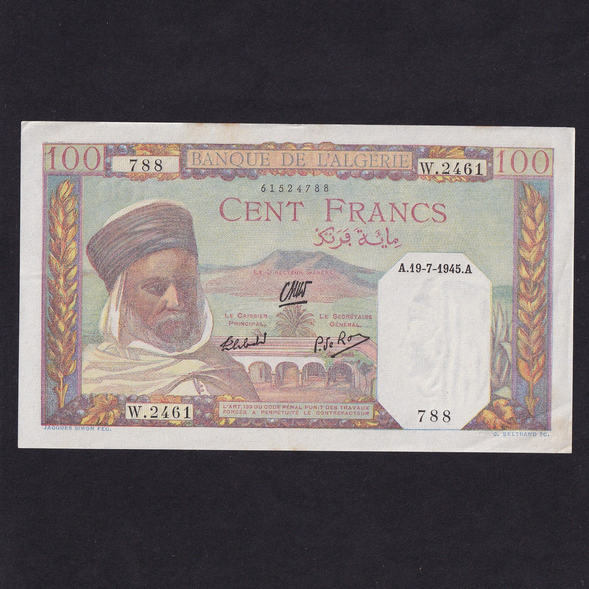 Decrease quantity for Algeria, 100 Francs, 19th July 1945, rust, Good EF
