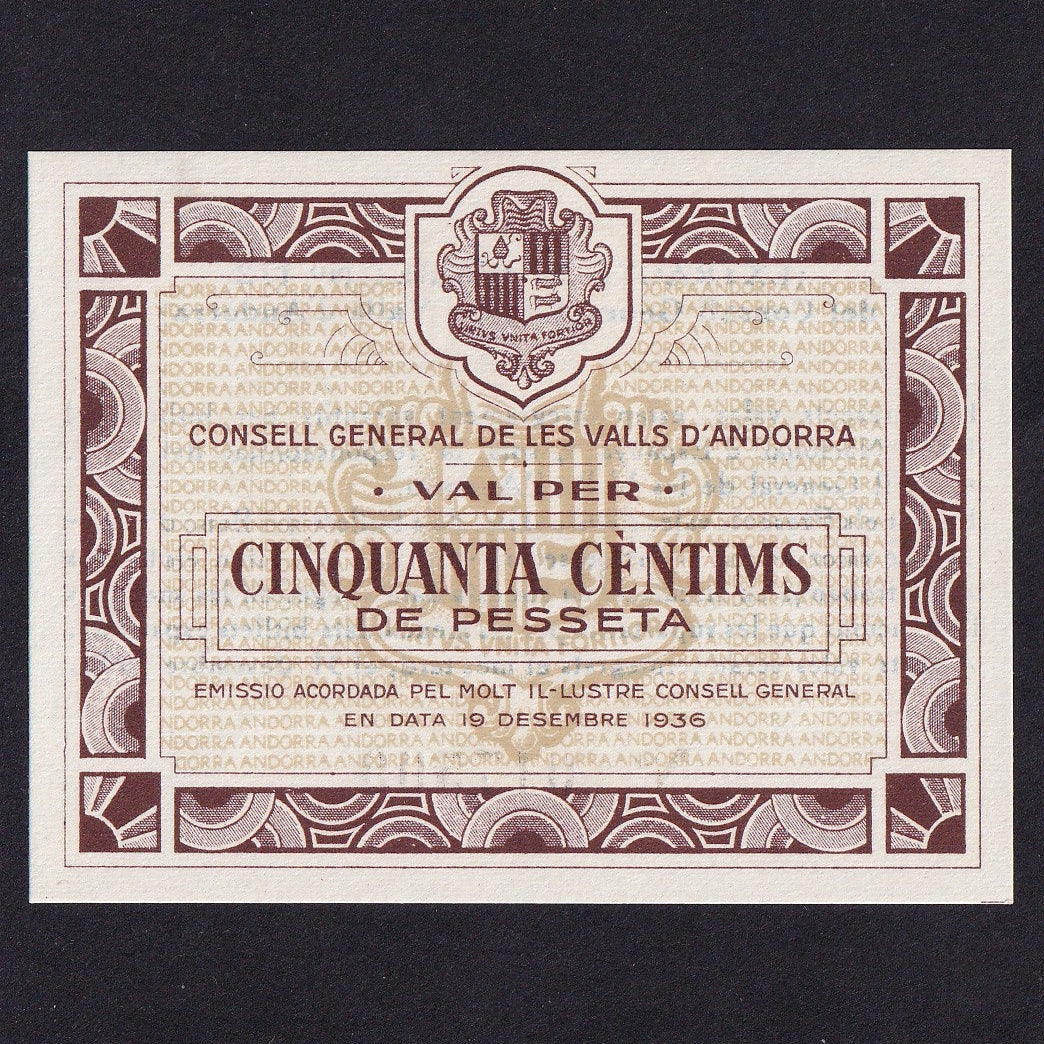 Andorra (P5) 50 Centimes, 1936, no.017499, UNC
