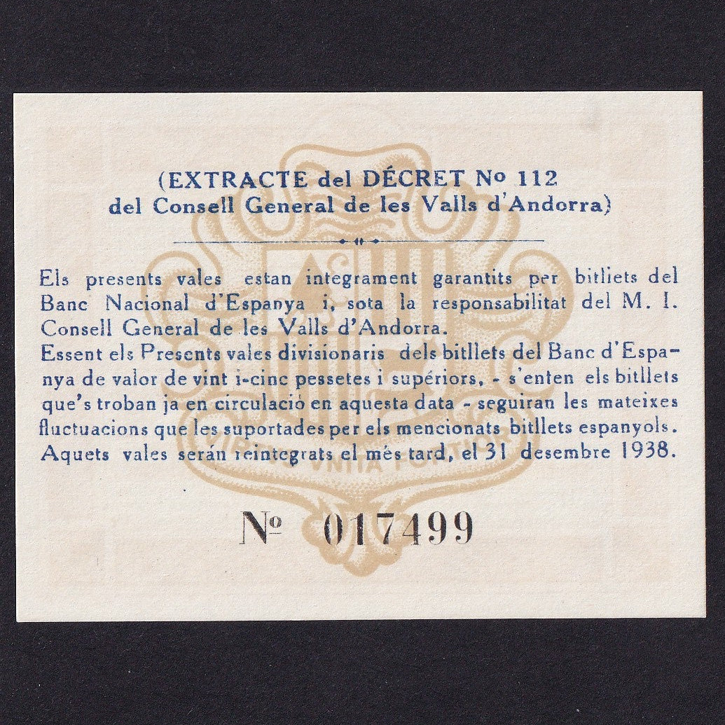 Decrease quantity for Andorra (P5) 50 Centimes, 1936, no.017499, UNC