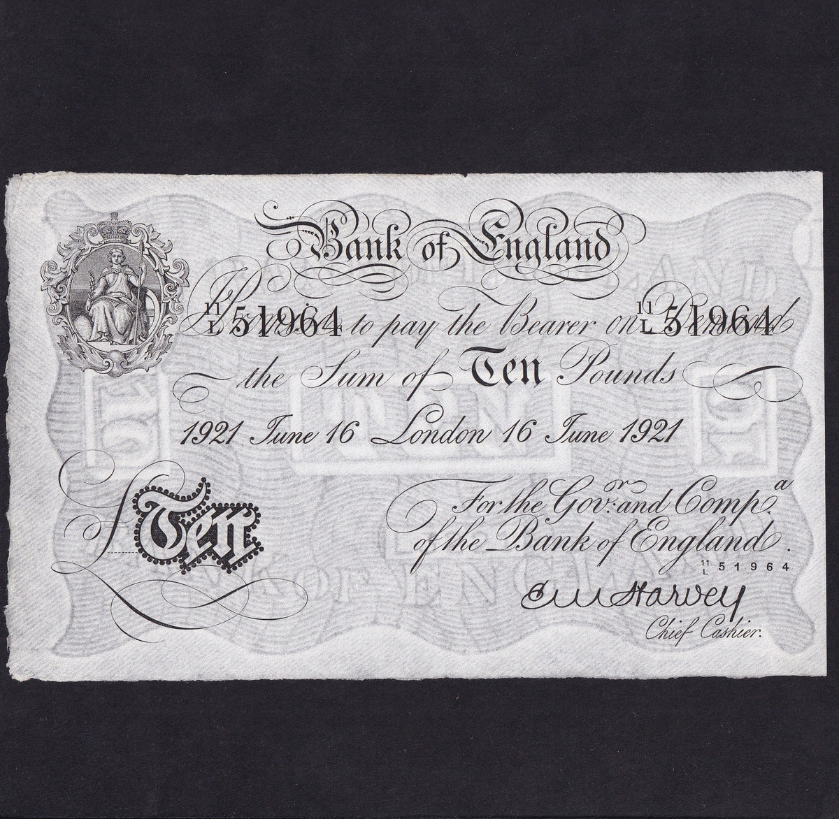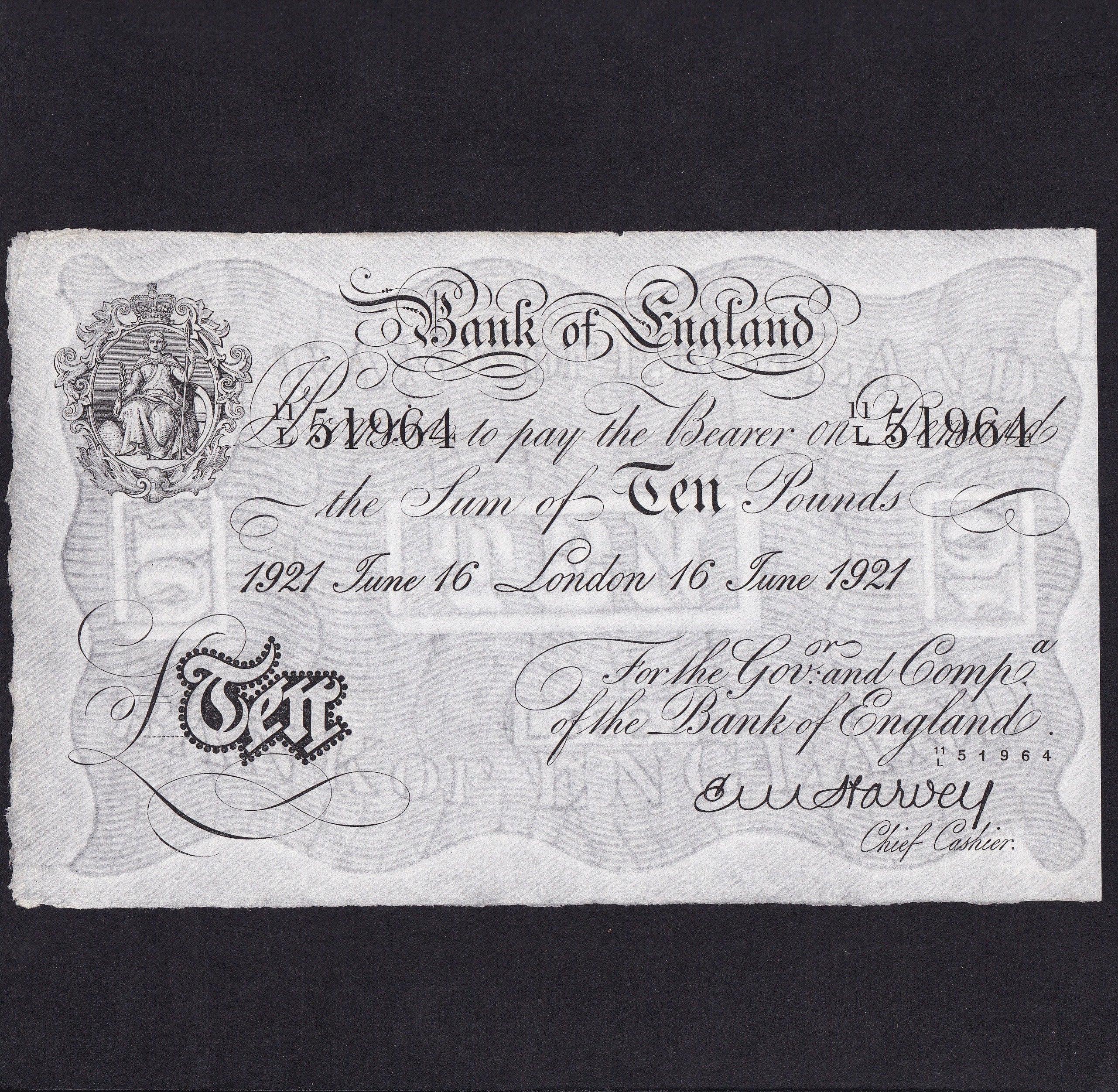 Bank of England (B209b) Harvey, £10, 16th June 1921, London, 20/L 28098, EF