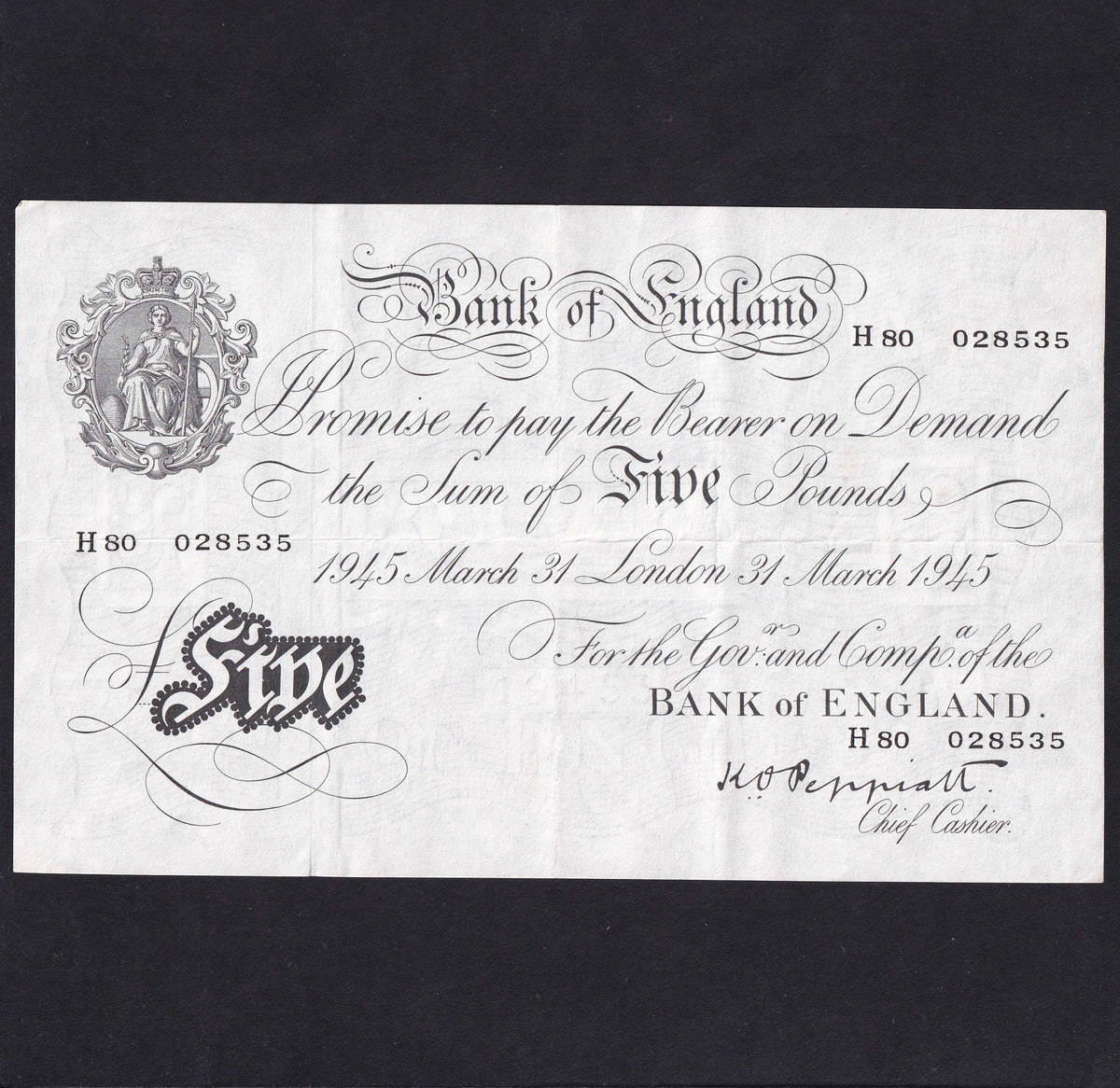 Bank of England (B255) Peppiatt, £5, 31st March 1945, H80 028535, thick paper, Fine/ VF
