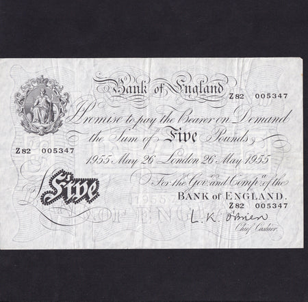 Bank of England (B275) O'Brien, £5, 26th May 1955, Z82 005347, Fine/VF
