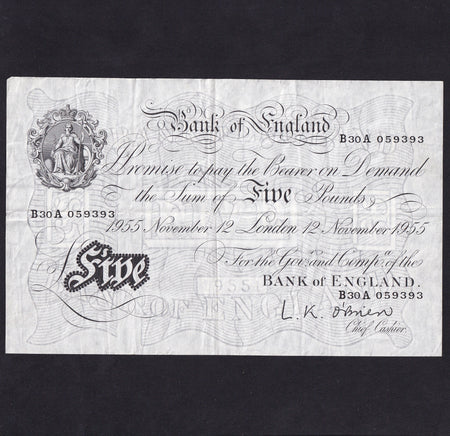 Bank of England (B276) O'Brien, £5, 12th November 1955, B30A 059393, Fine/ VF