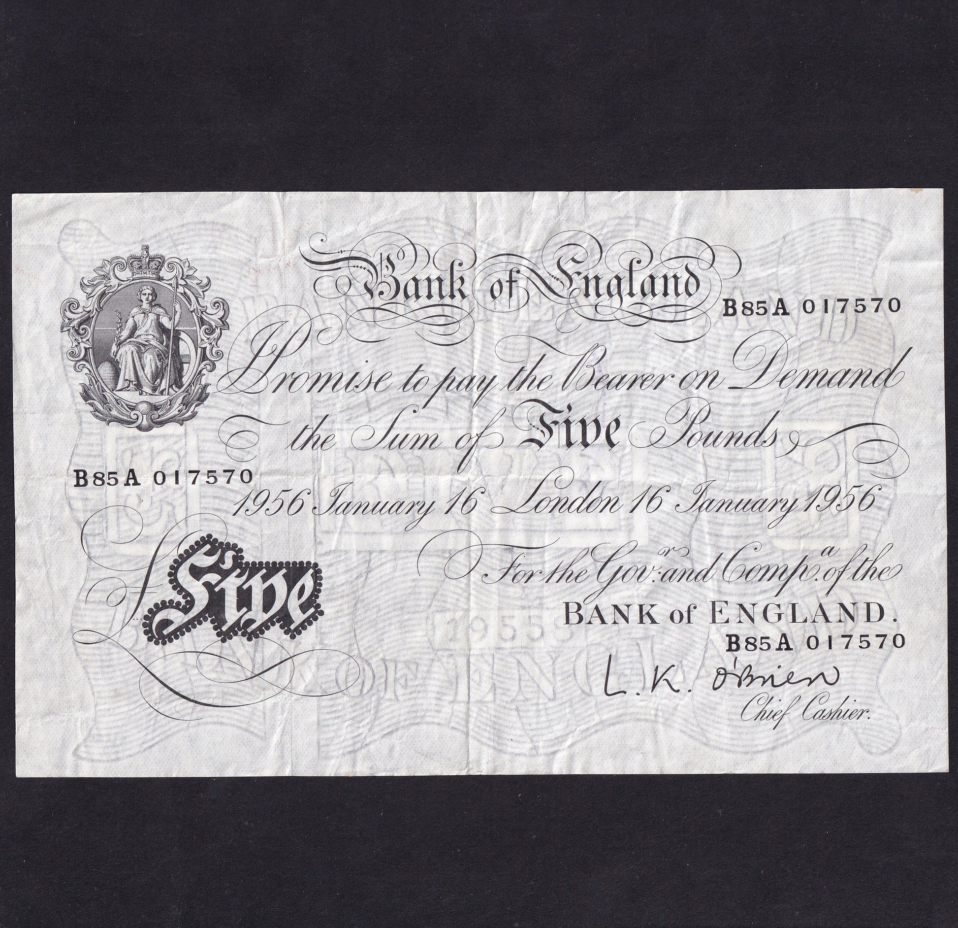 Bank of England (B276) O'Brien, £5, 16th January 1956, B85A 017570, Fine/ VF