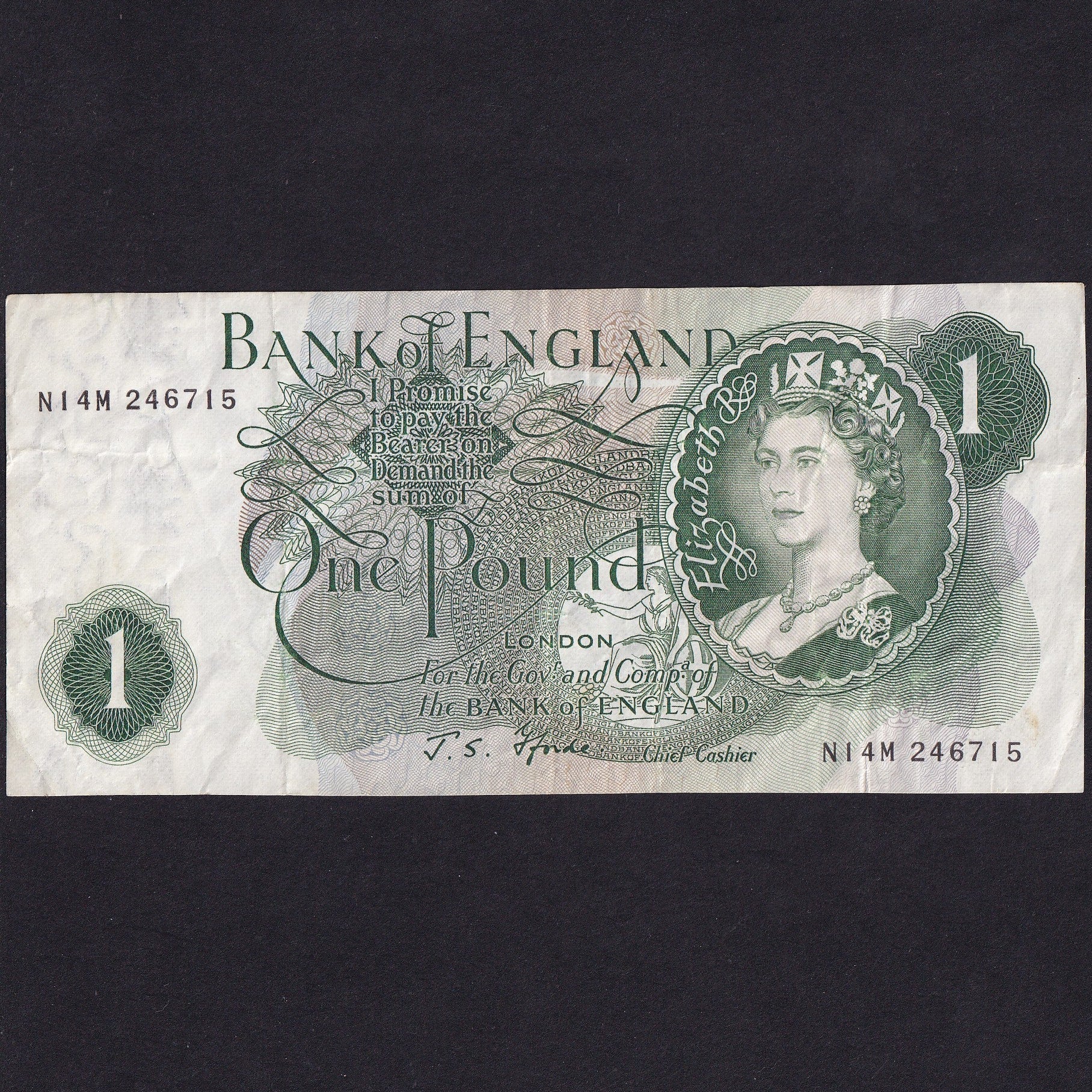 Decrease quantity for Bank of England (B308) Fforde, £1 'G' note, N14M 246715, last million, Fine