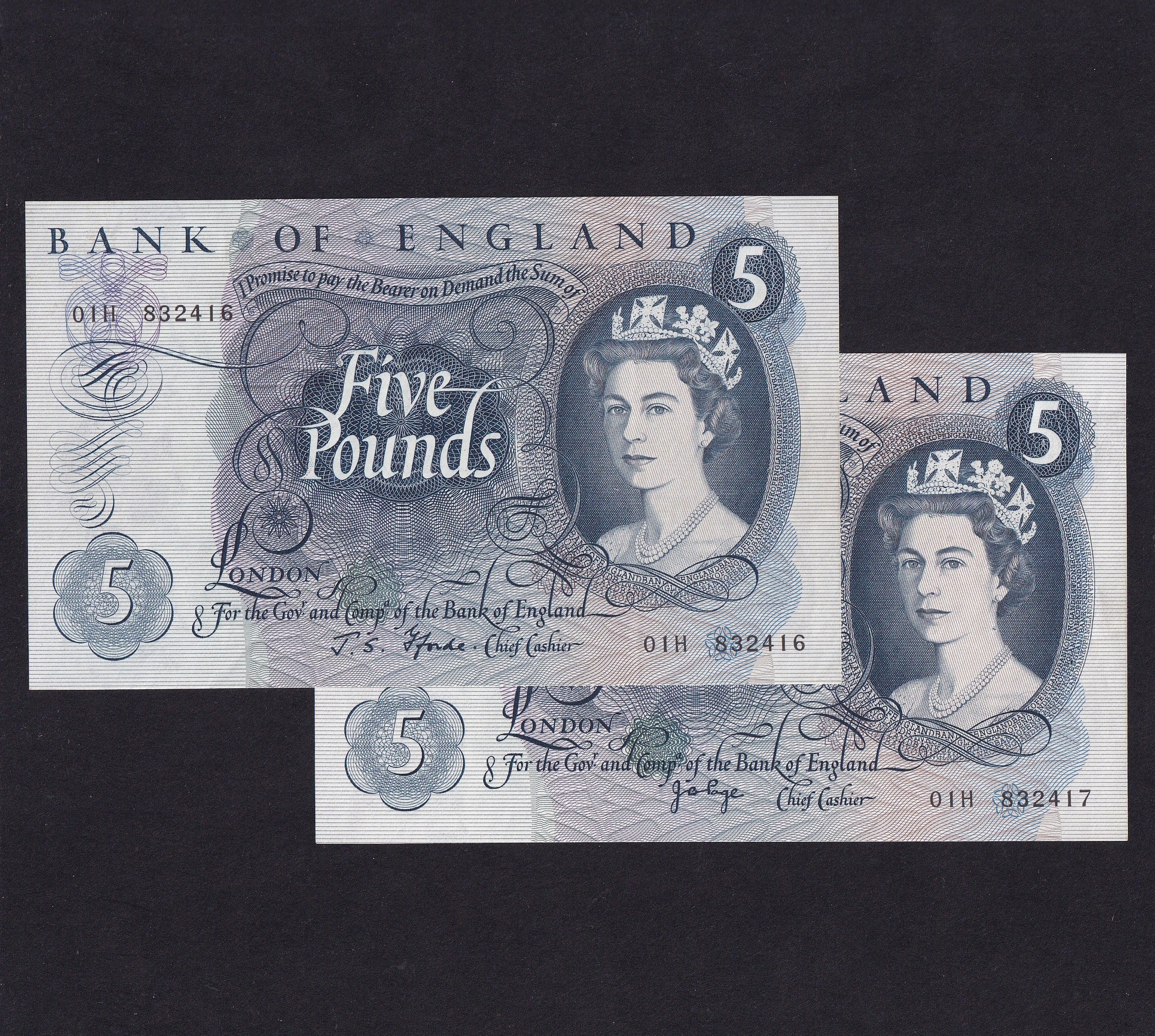 Bank of England (B314p) Fforde £5 01H 832416 & Page £5 01H 832417, signature sequence pair, EF