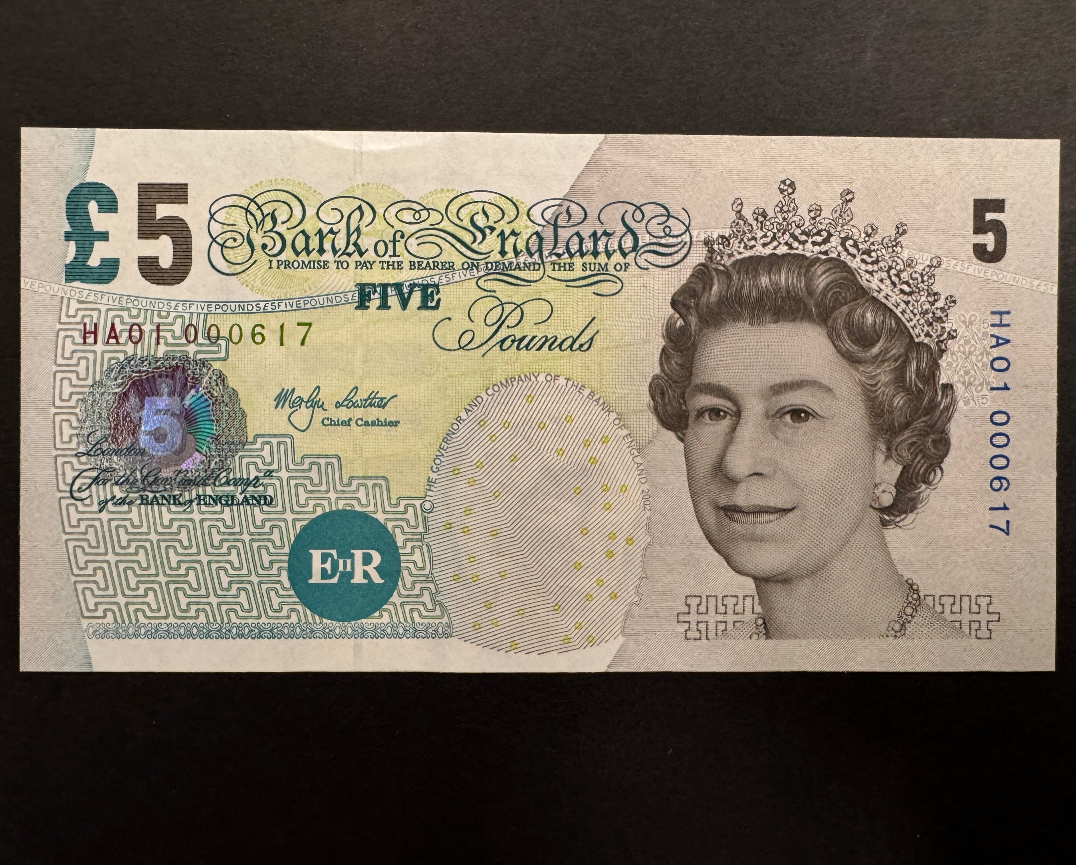 Bank of England (B393) Hollom, £5, HA01 000617, first million, UNC