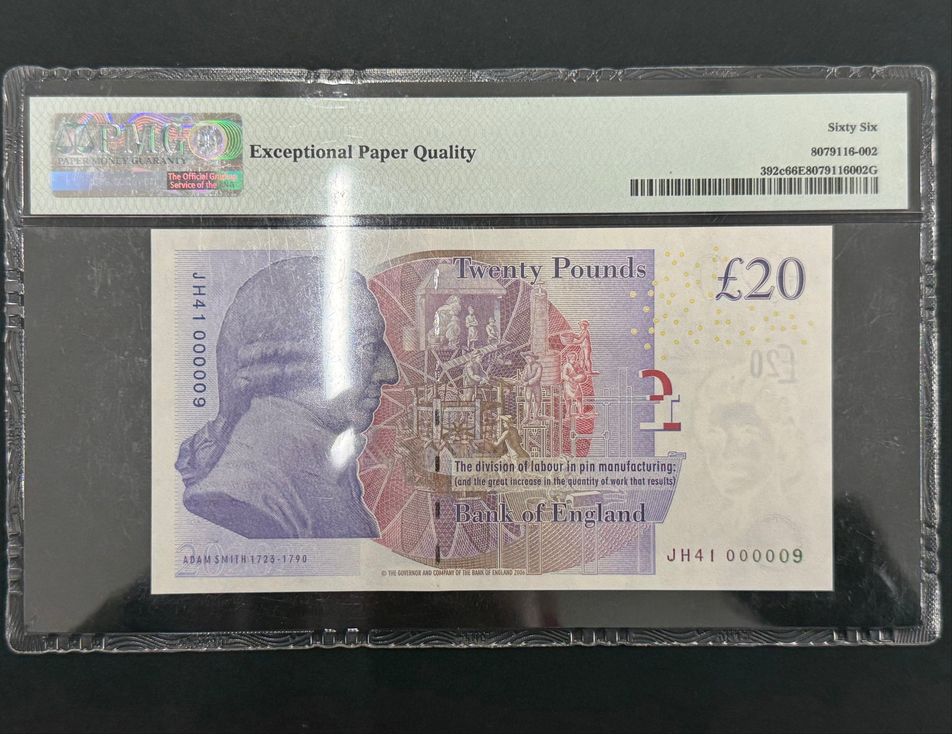 Bank of England (B412) Cleland, £20, JH41 000009, first million & low serial (so far very few first million notes sold with such a low serial), PMG66, UNC
