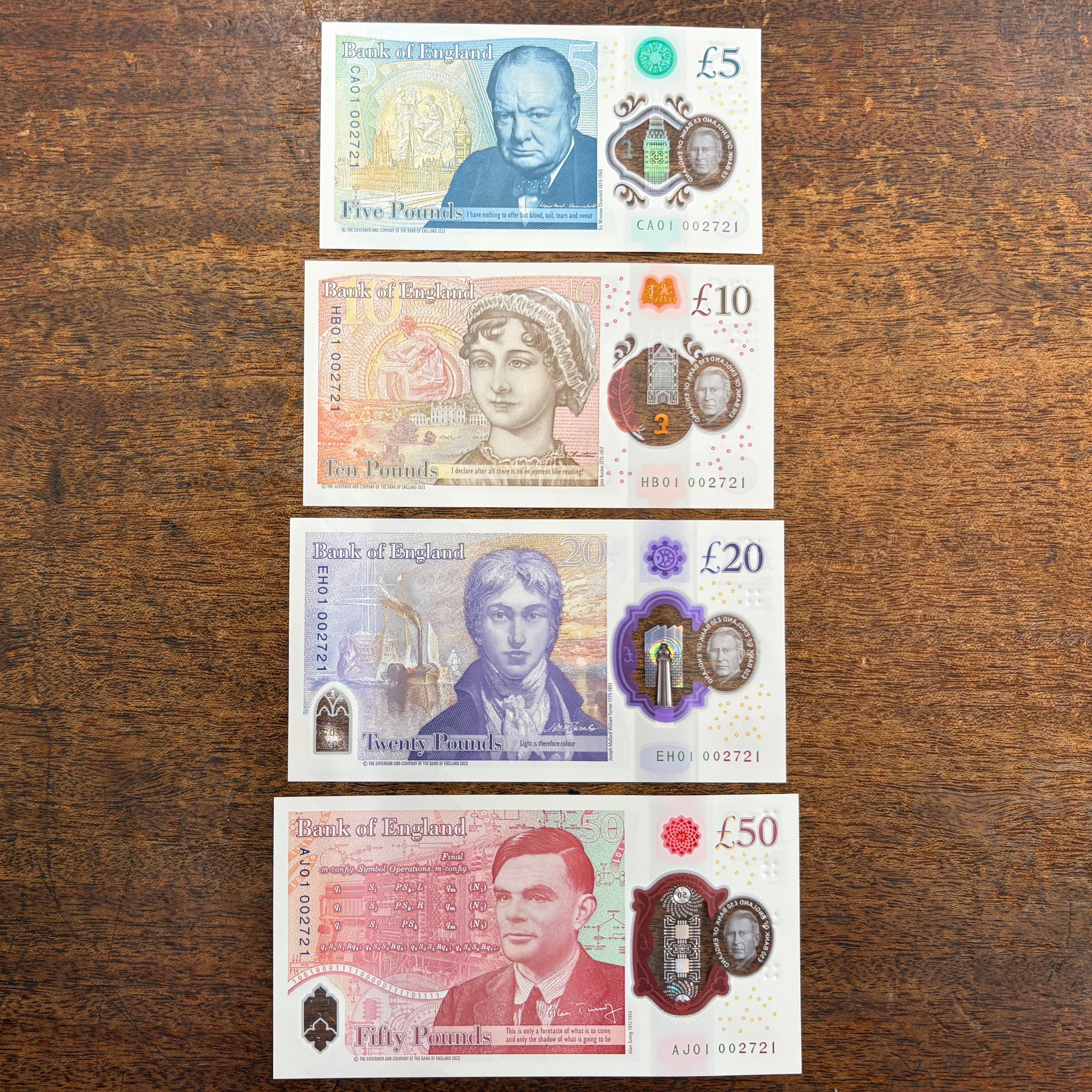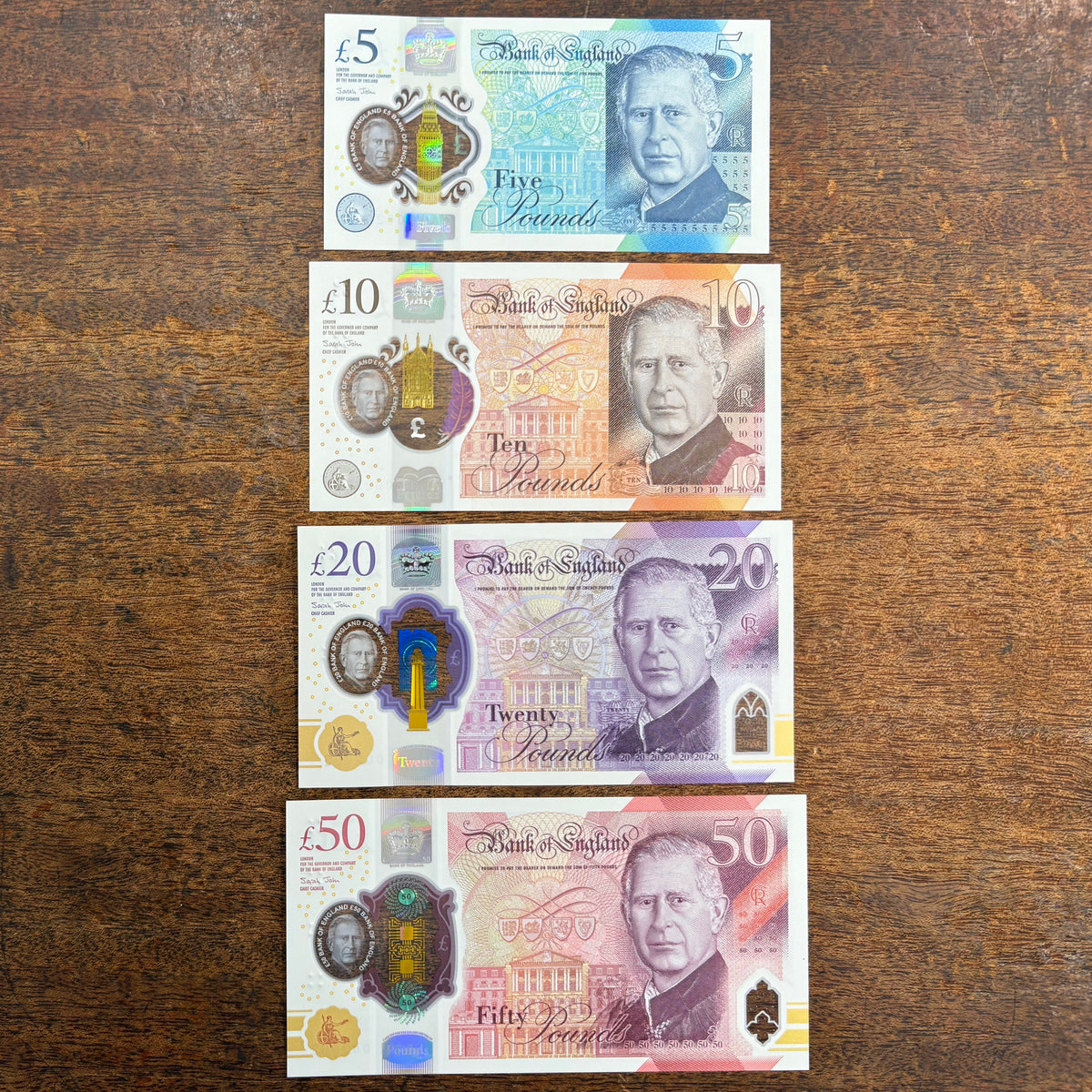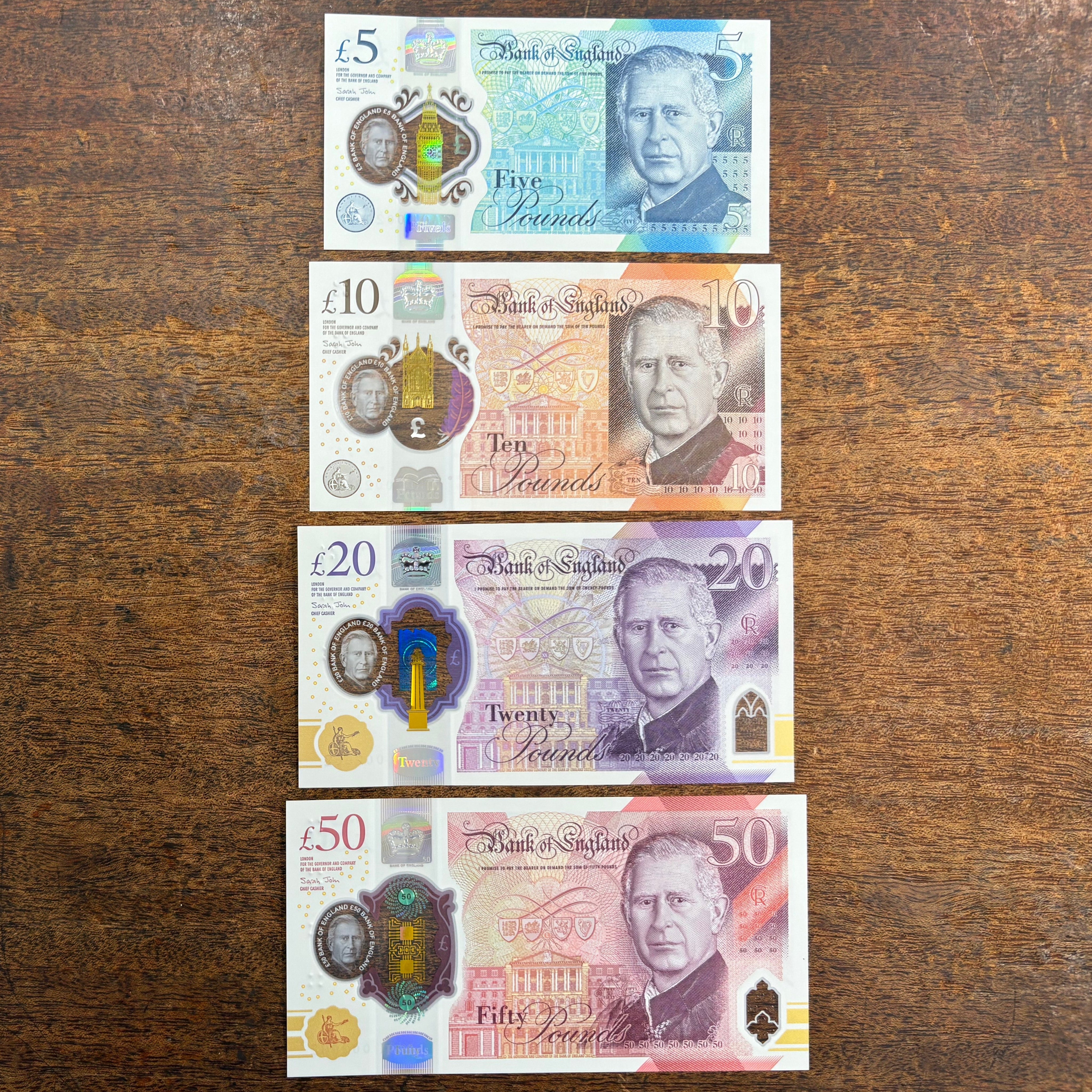Bank of England (B419-422) £5, £10, £20 & £50 matched number set 002283, CA01, HB01, EH01 & AJ01, all 002721, first million, King Charles III, UNC
