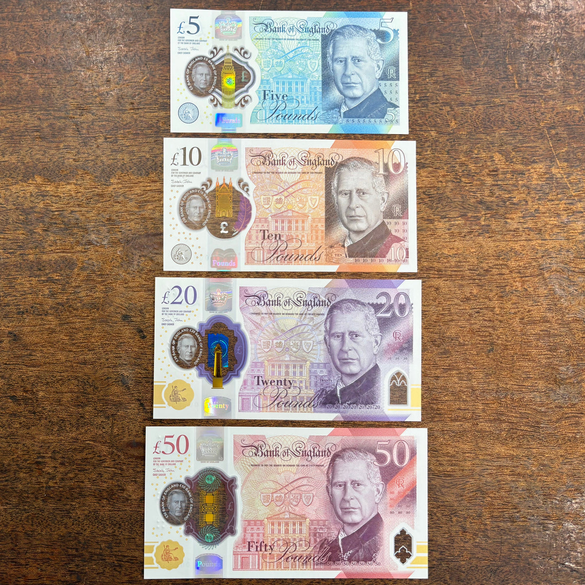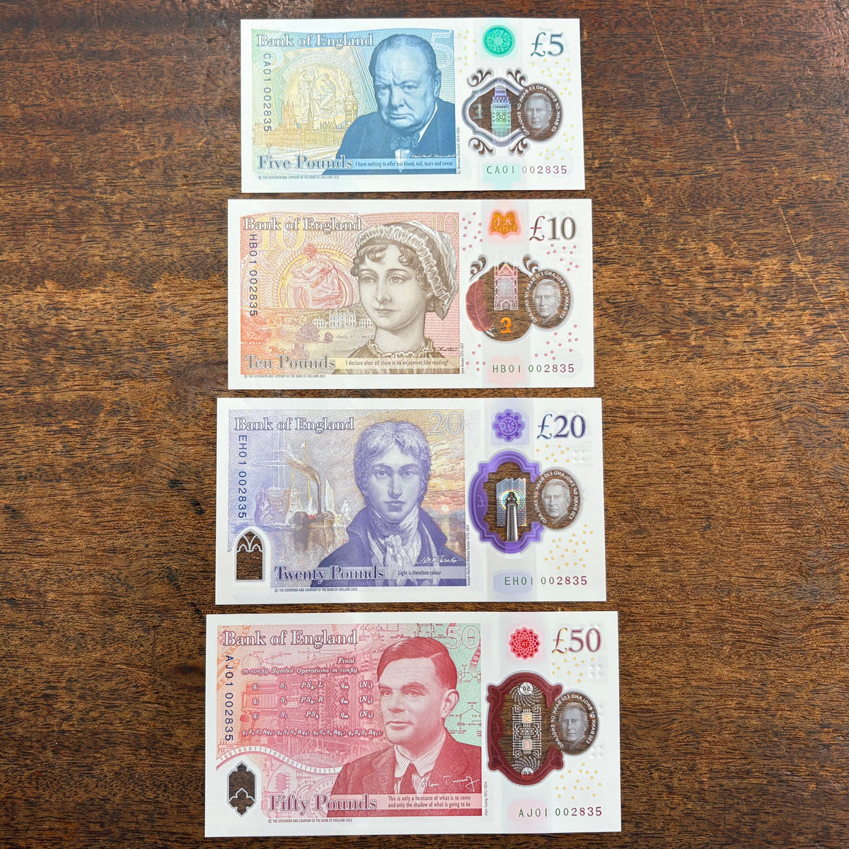 Bank of England (B419-422) £5, £10, £20 & £50 matched number set 002811 , CA01, HB01, EH01 & AJ01, all 002835, first million, King Charles III, UNC