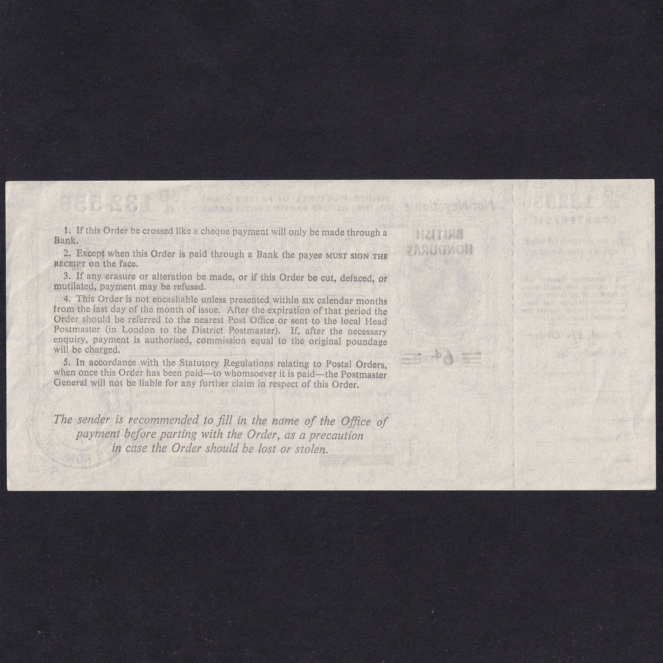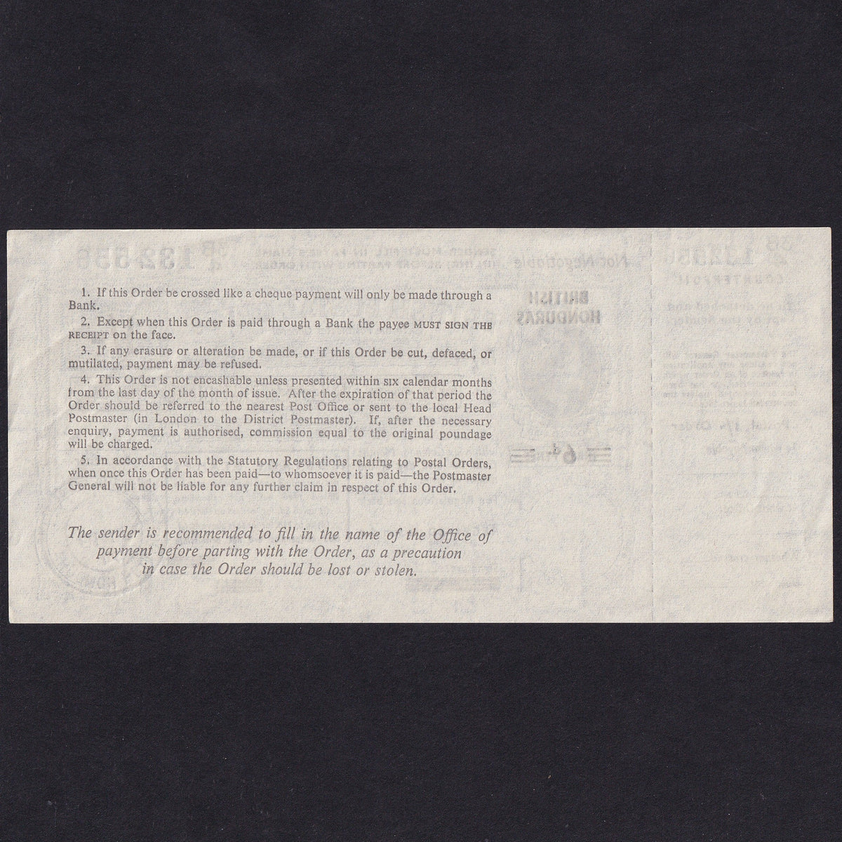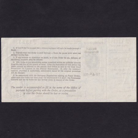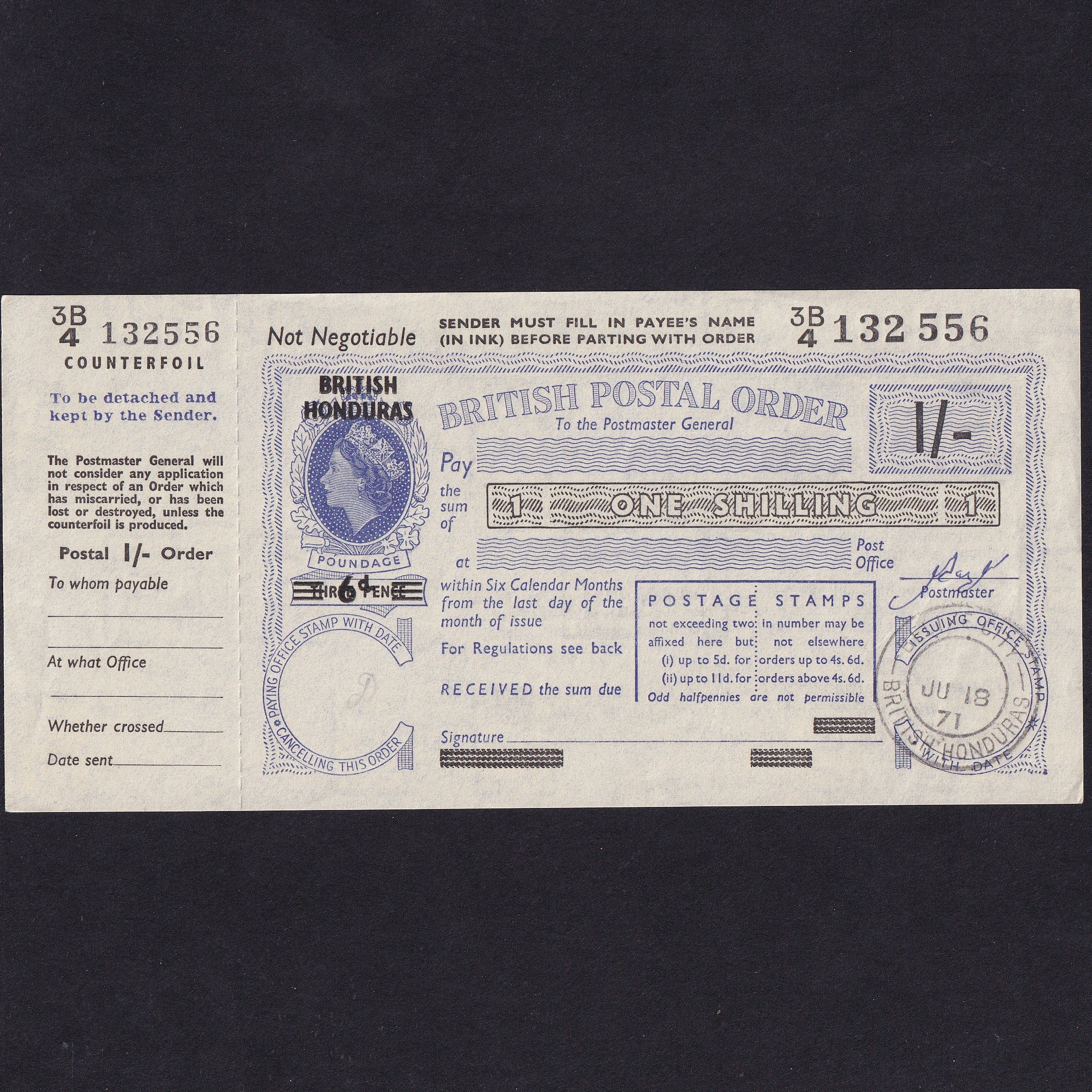 British Honduras, 1 Shilling Postal Order, 1971, QEII, 3B4 132556, Good EF