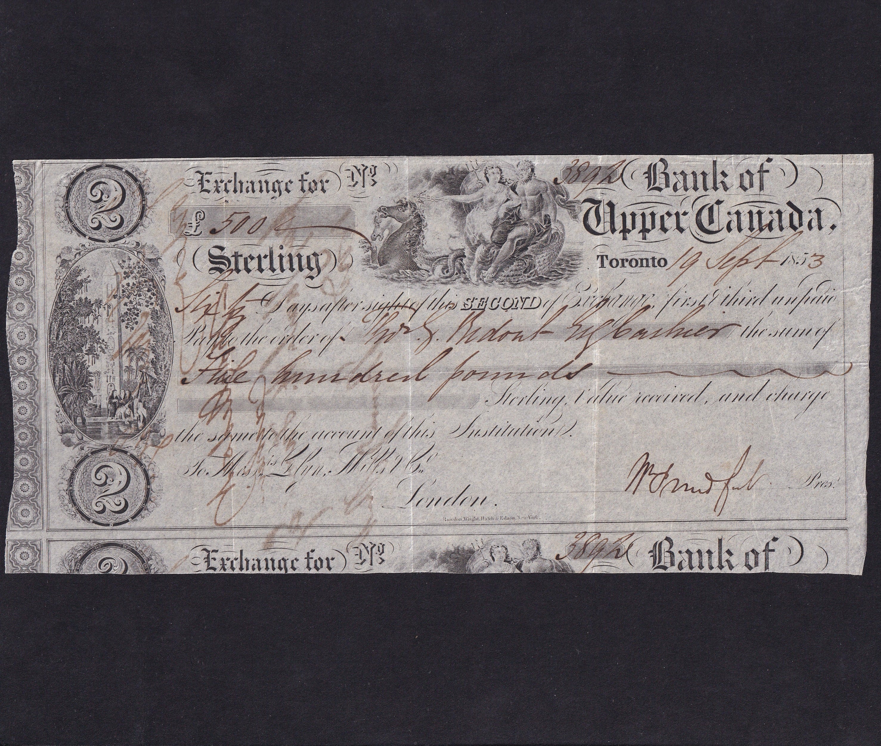 Canada, £500 sight note, 1853, for Bank of Upper Canada, Toronto, VF