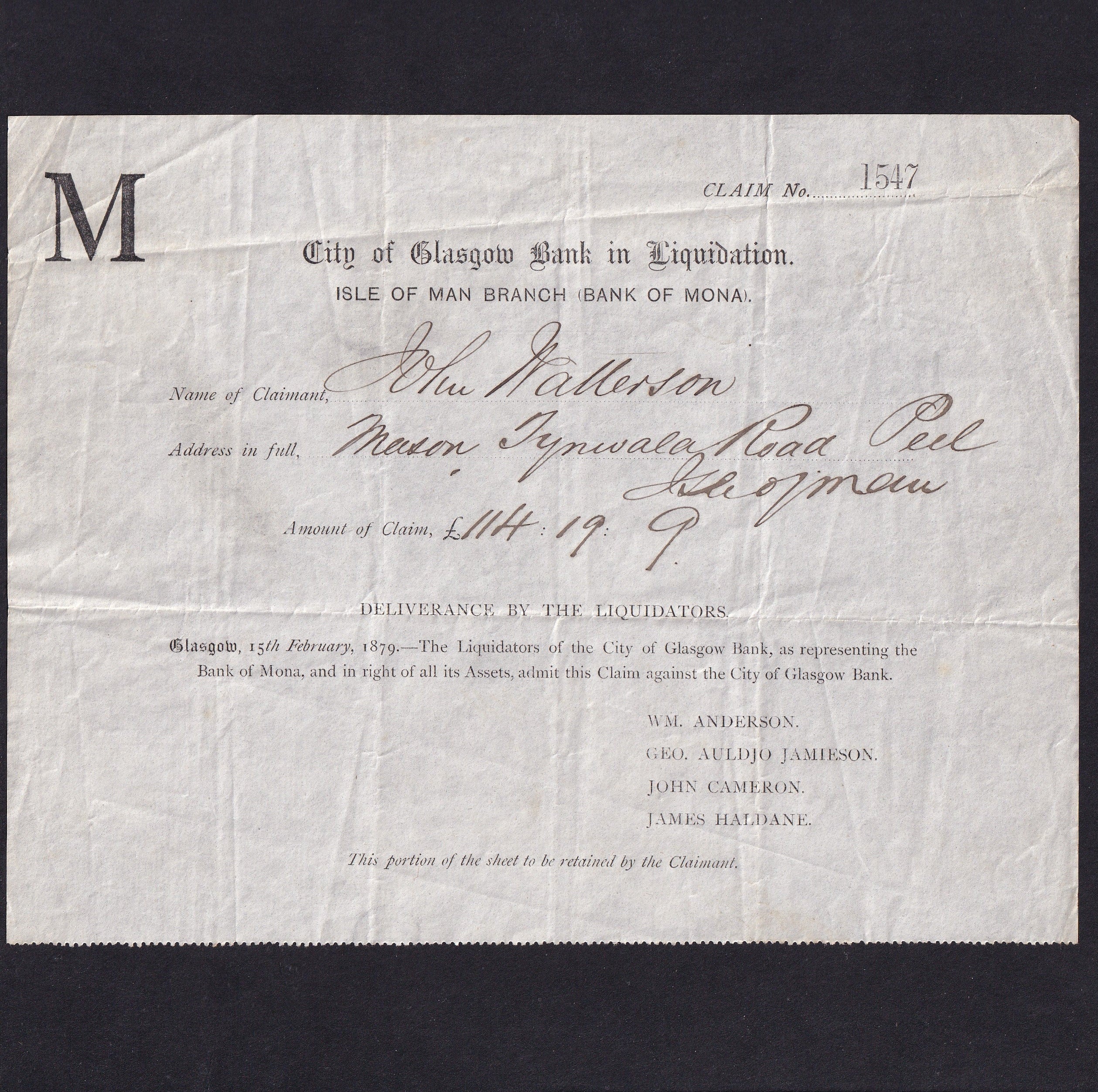 City of Glasgow Bank in Liquidation, Isle of Man Branch (Bank of Mona) claim form no.1547