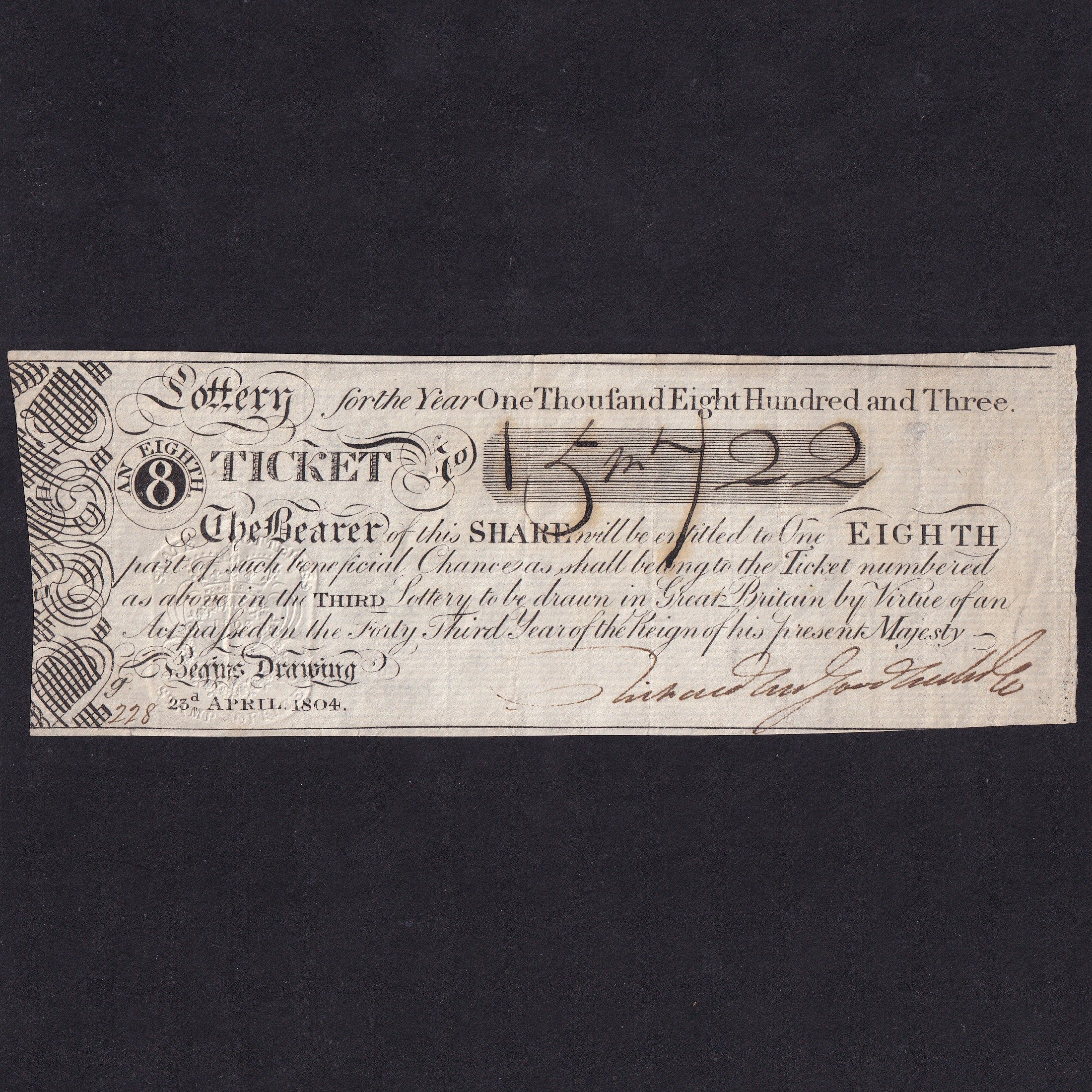 England, 1/8th Lottery Ticket, 1803, no.15/722, EF
