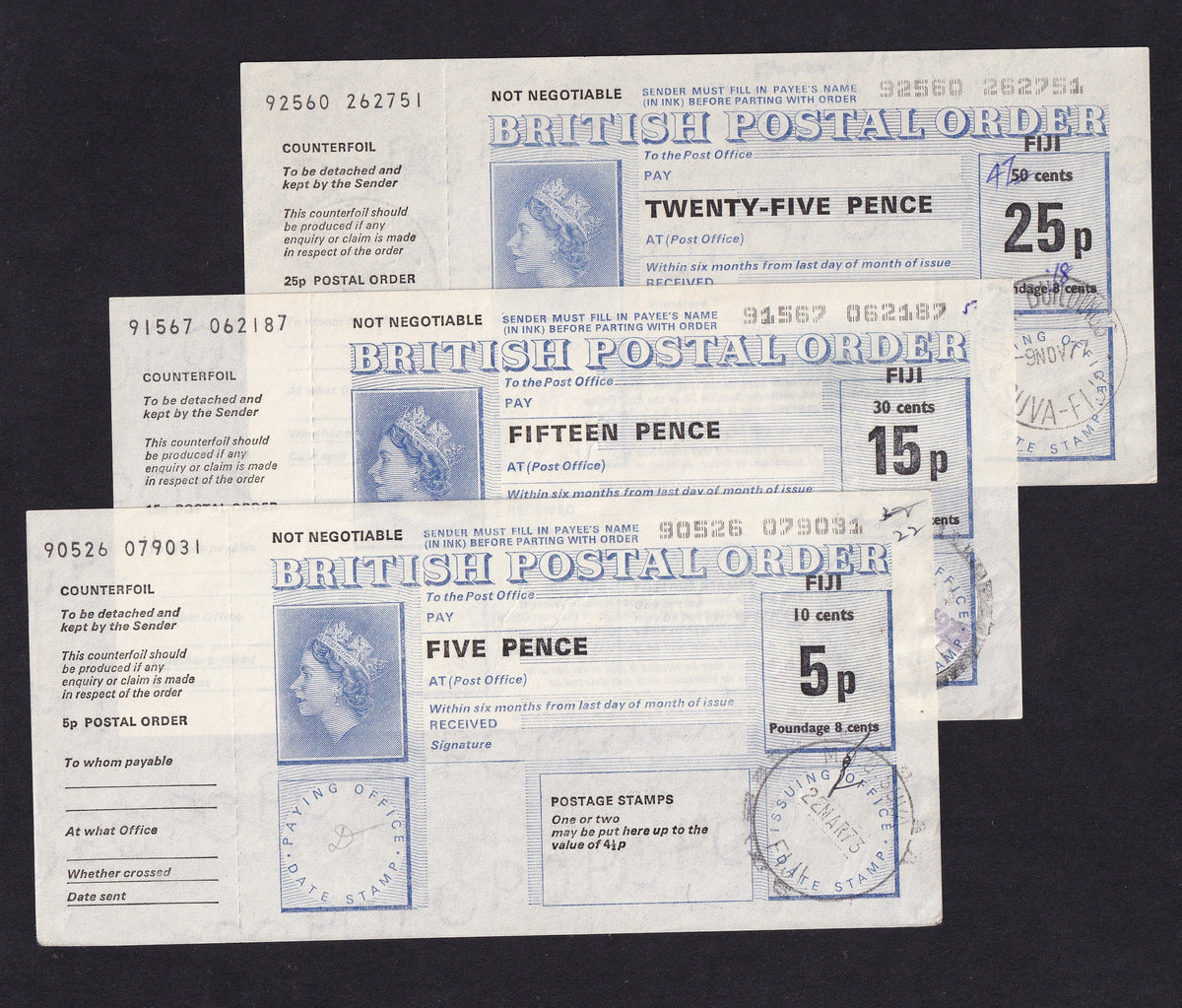 Increase quantity for Fiji, three postal orders, 5p, 15p & 25p, 1977, Good EF