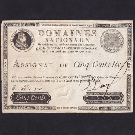 France (Assignats, PA40) 500 Livres, 29th September 1790, King Louis XVI, no.12300, rust, A/VF