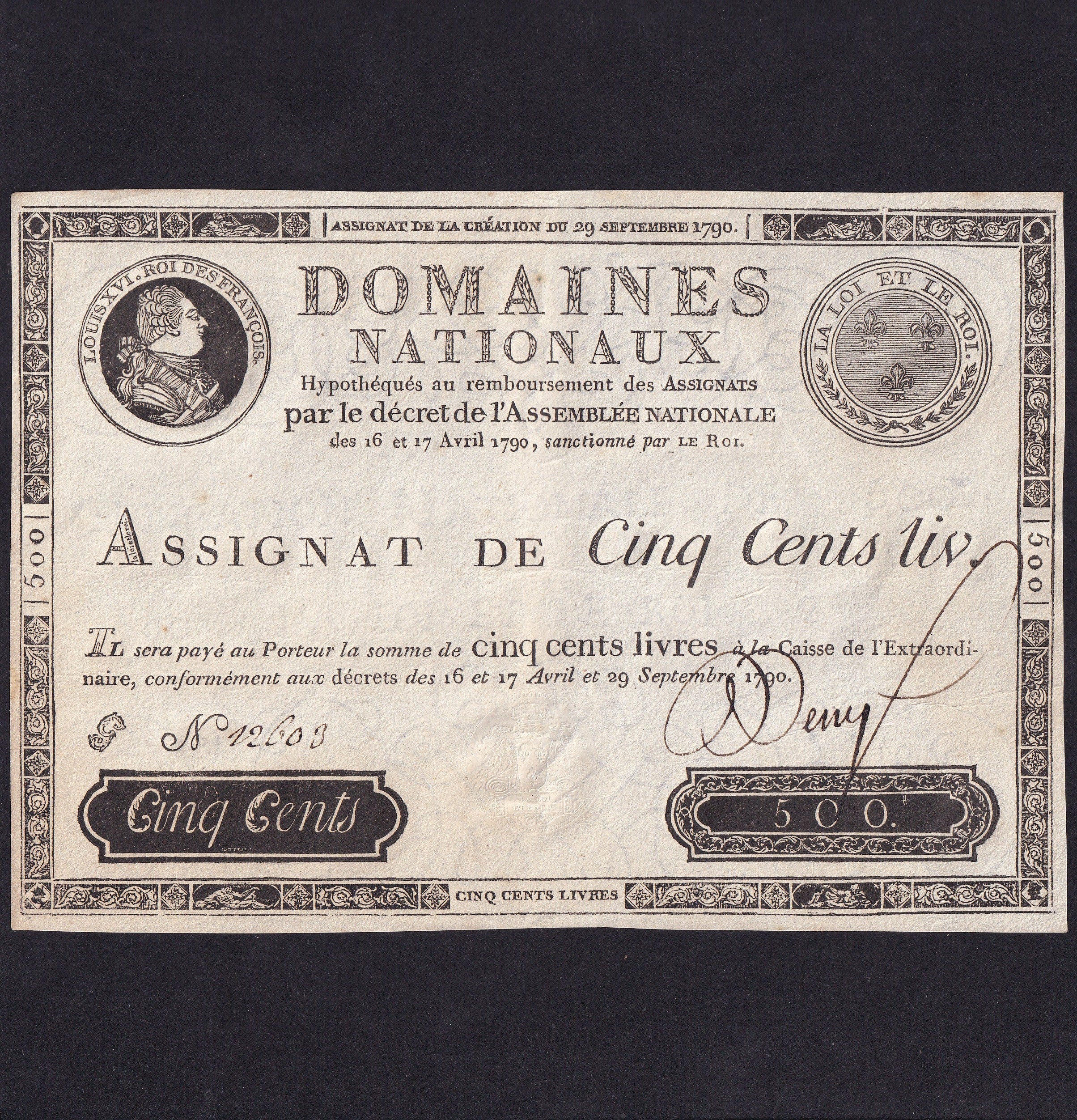 France (Assignats, PA40) 500 Livres, 29th September 1790, King Louis XVI, no. 12603, A/VF