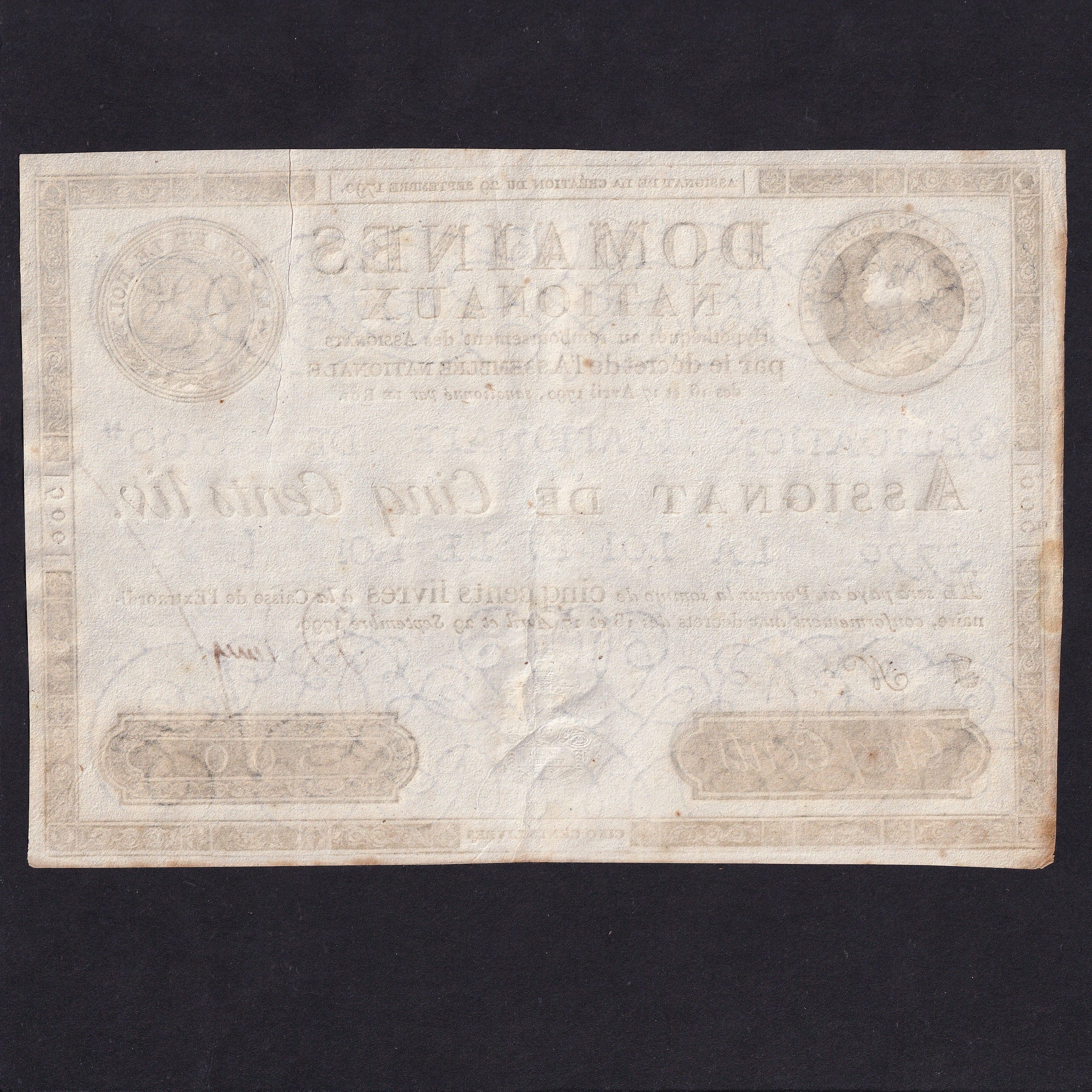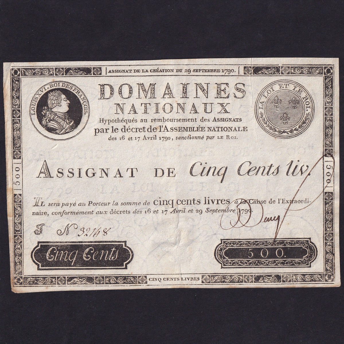 France (Assignats, PA40) 500 Livres, 29th September 1790, King Louis XVI, no.32148, rust, Good VF