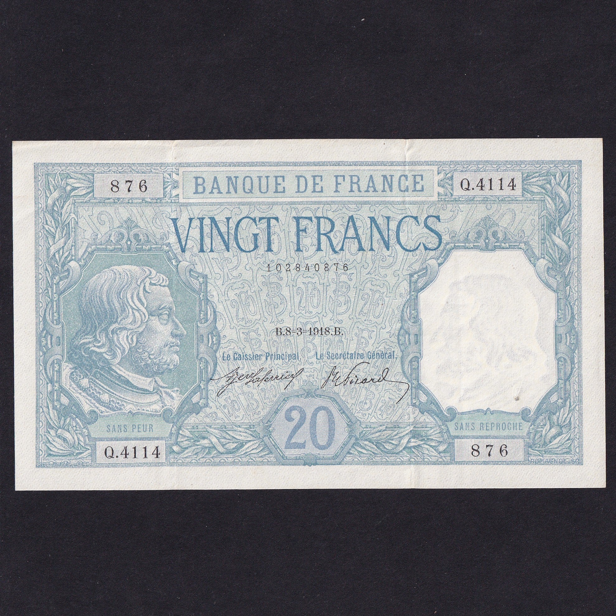 France (P74) 20 Francs, 8th March 1918, Bayard, Q4114876, two folds, otherwise EF, strong paper, pinhole, A/EF