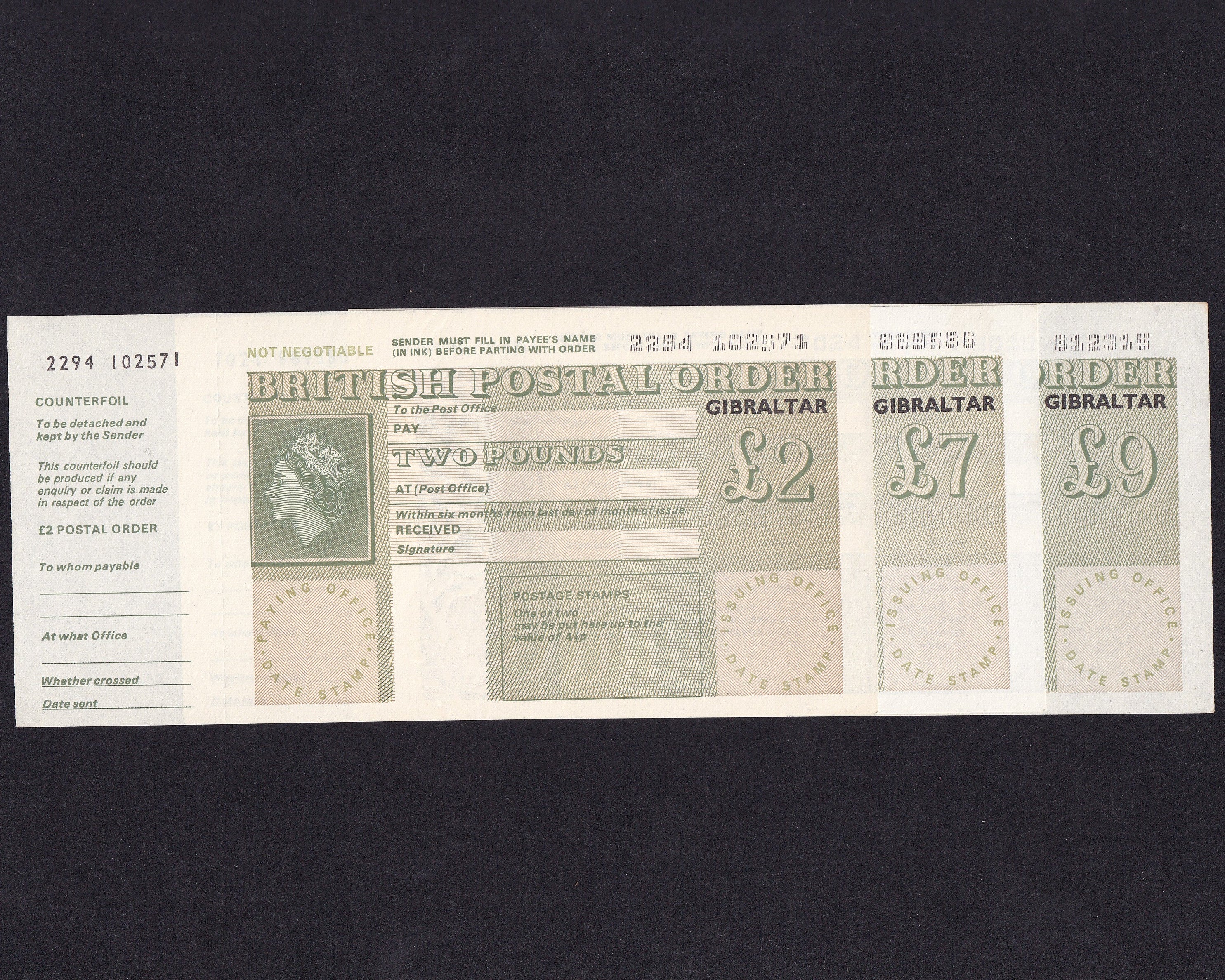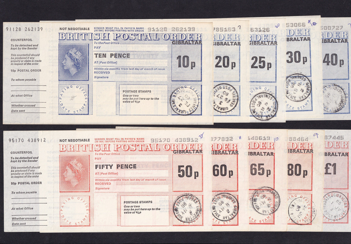 Gibraltar, 13 Postal Orders Set: 10p, 20p, 25p, 30p, 40p, 50p, 60p, 65p, 80p, £1, £2, £7 & £9, 1980s, Good EF