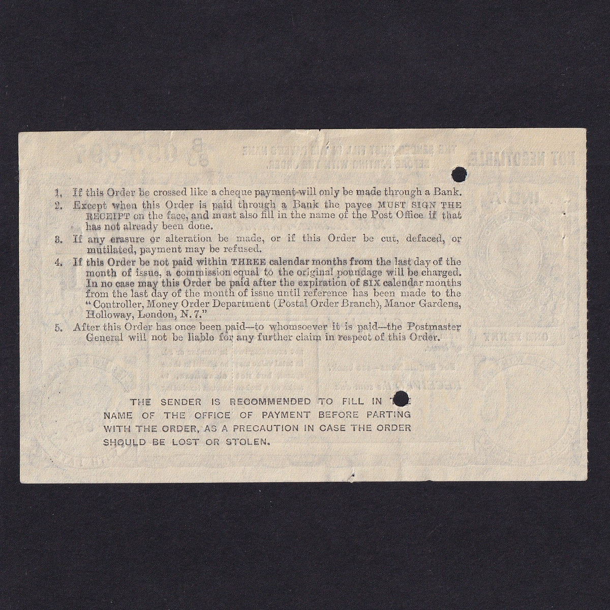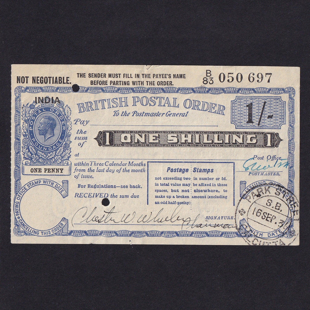 India, 1 Shilling postal order, 1936, KGV, Calcutta, B83 050697, small tear, Good EF