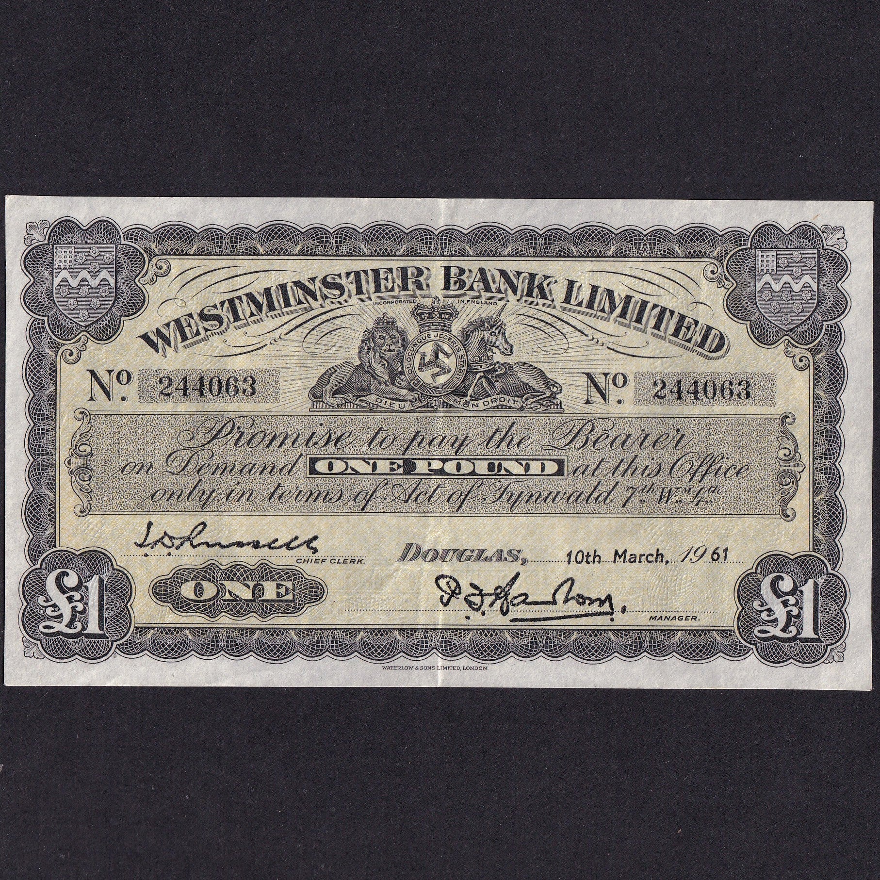 Isle of Man (P23Ab) Westminster Bank, £1, 10th March 1961, note no.244063, M314, (101) notes outstanding, Good VF