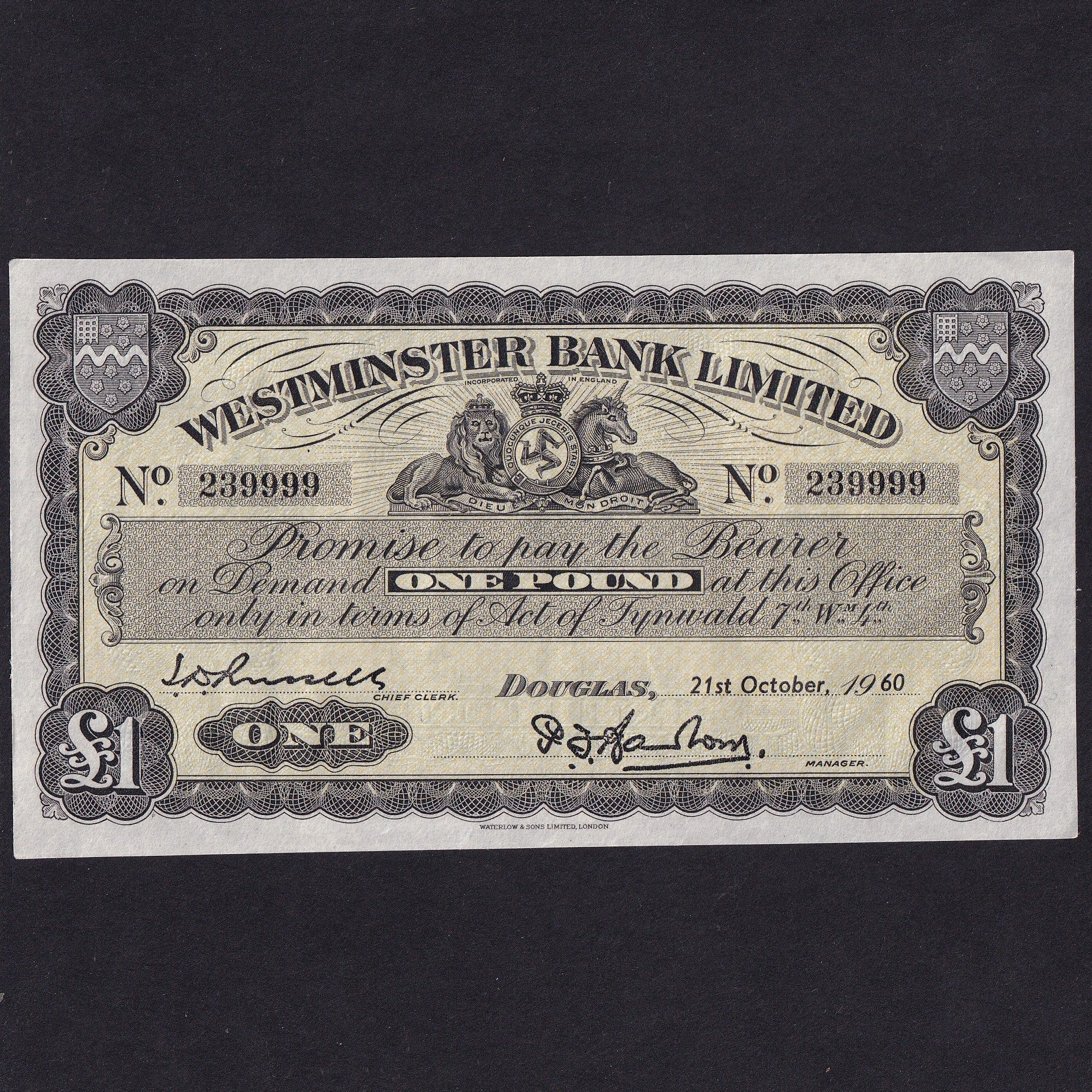 Isle of Man (P23Ab) Westminster Bank Limited, £1, 21st October 1960, note no.239999, M314, (134) notes outstanding, A/UNC