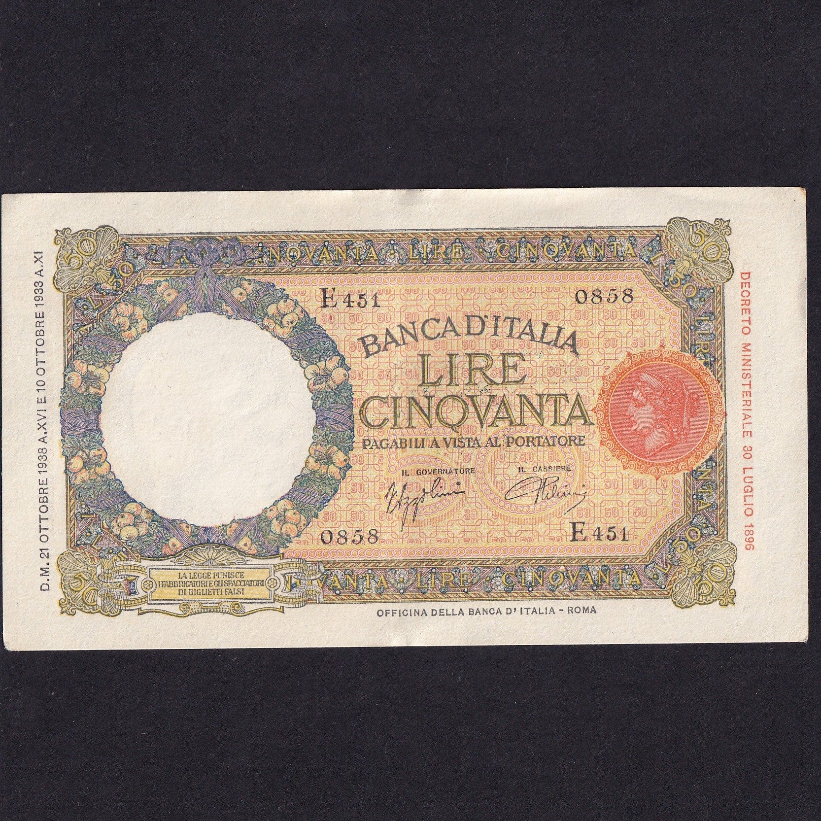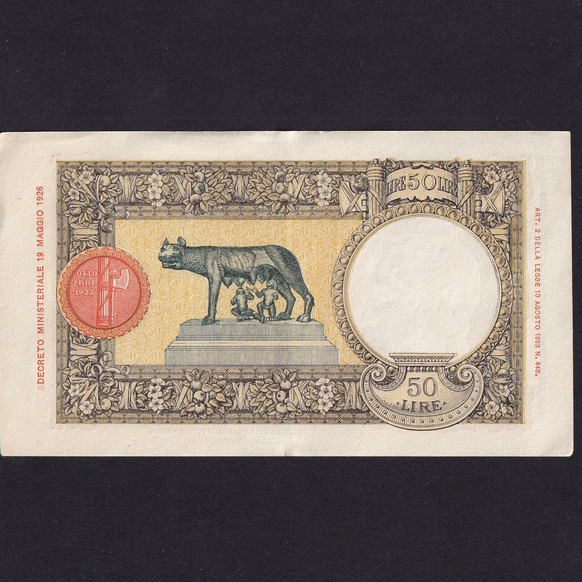 Italy (P54b) 50 Lire, 1938, Azzolini/Urbini, she-wolf with twins reverse, Good EF
