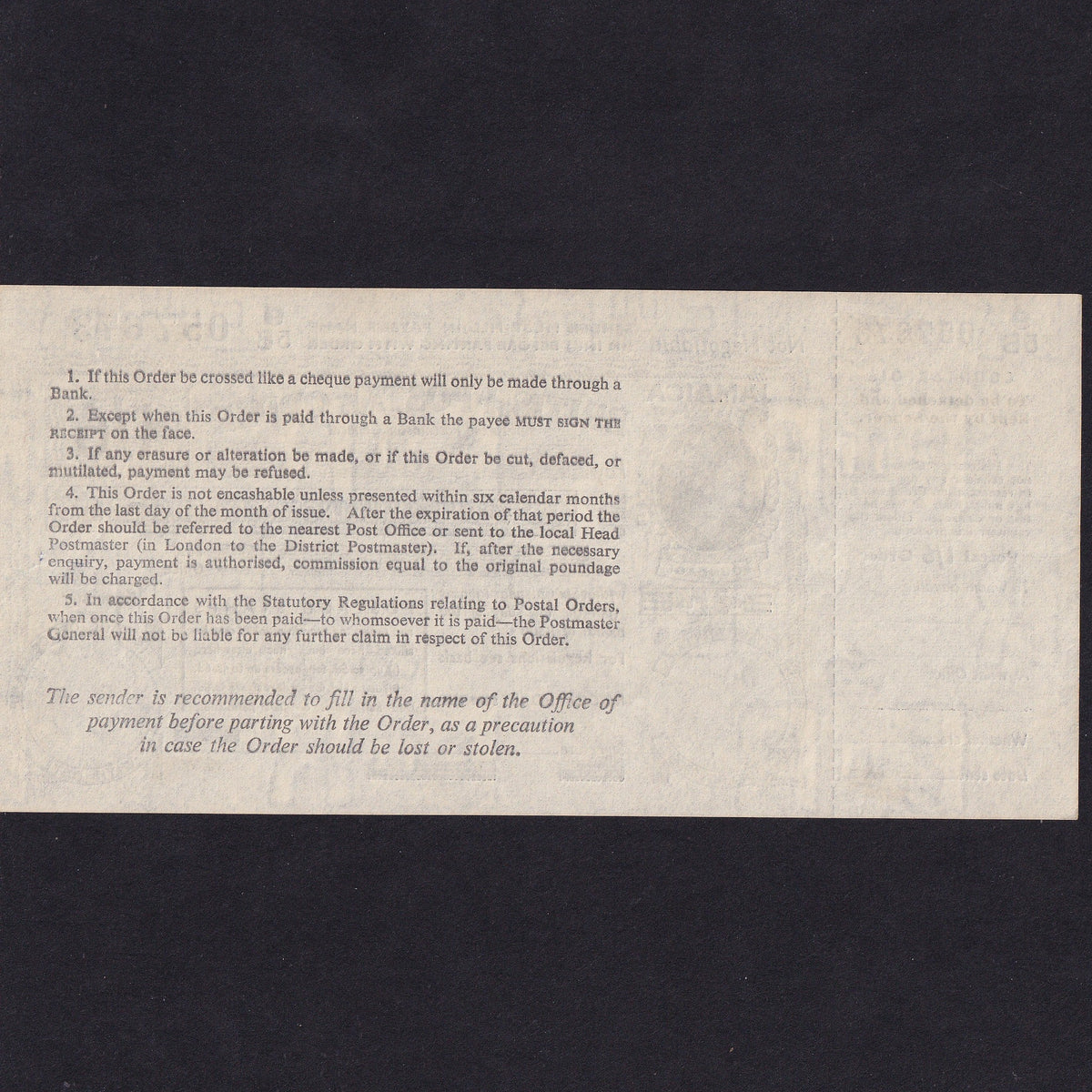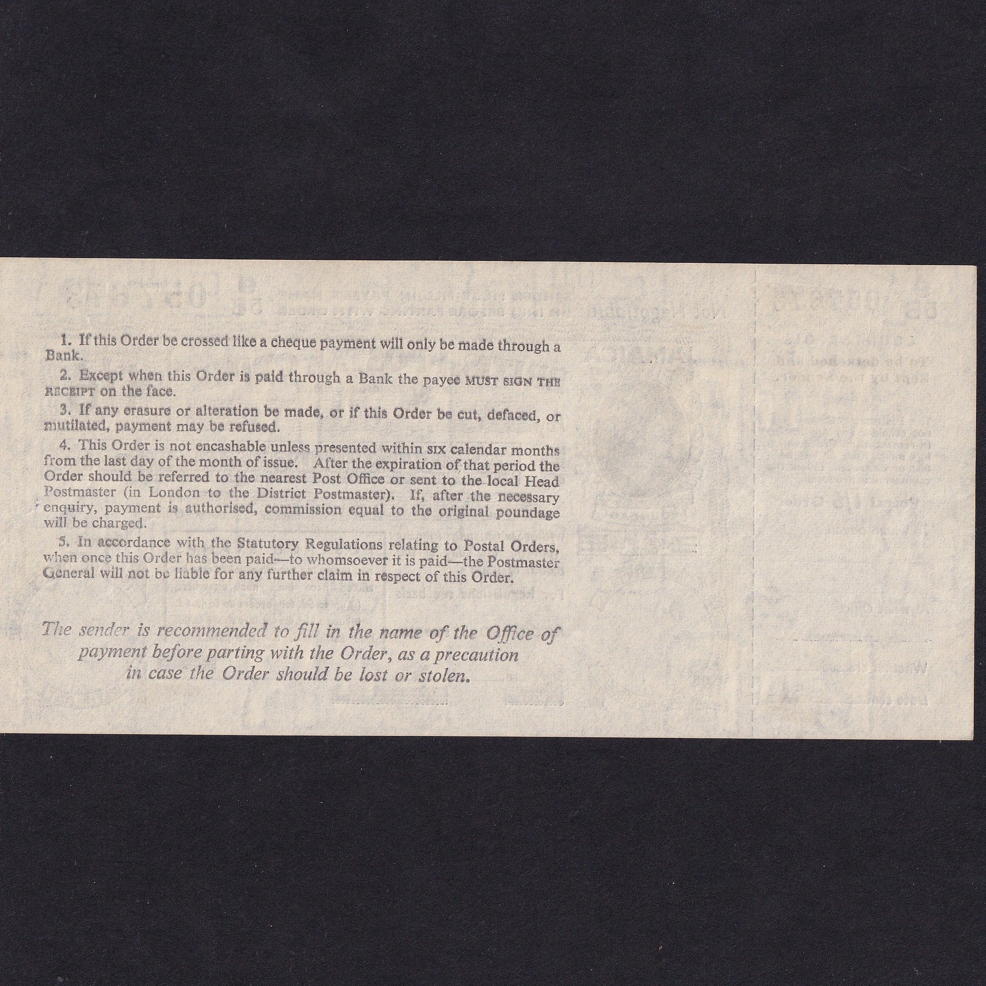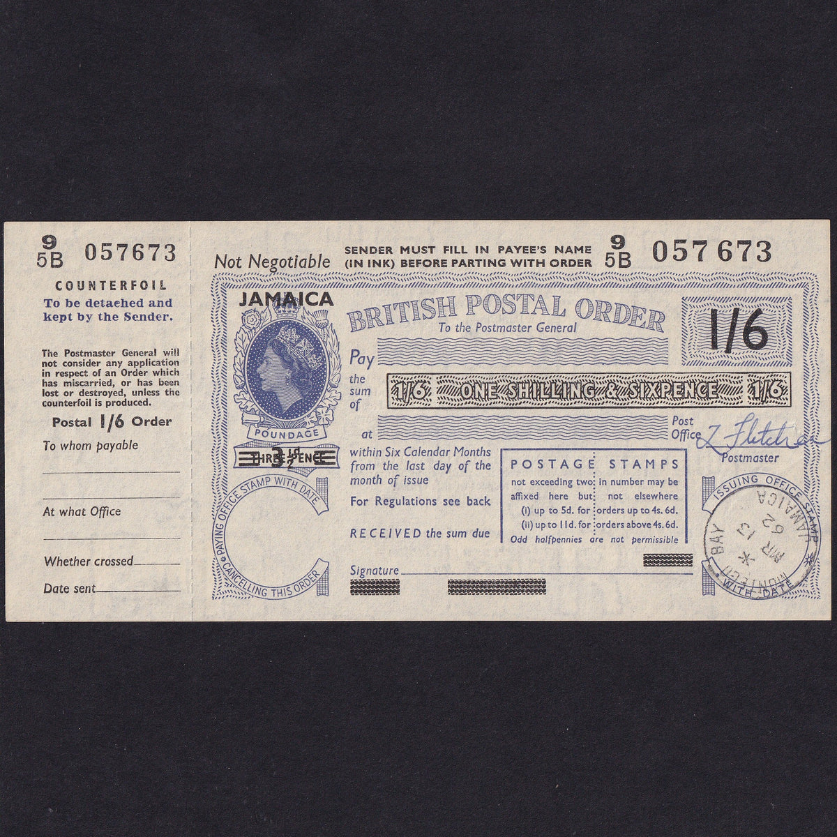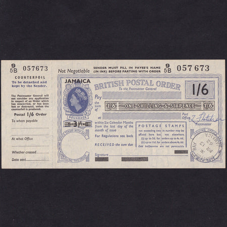 Jamaica, One Shilling & Six Pence Postal Order, 1962, 95B 057673, Good EF