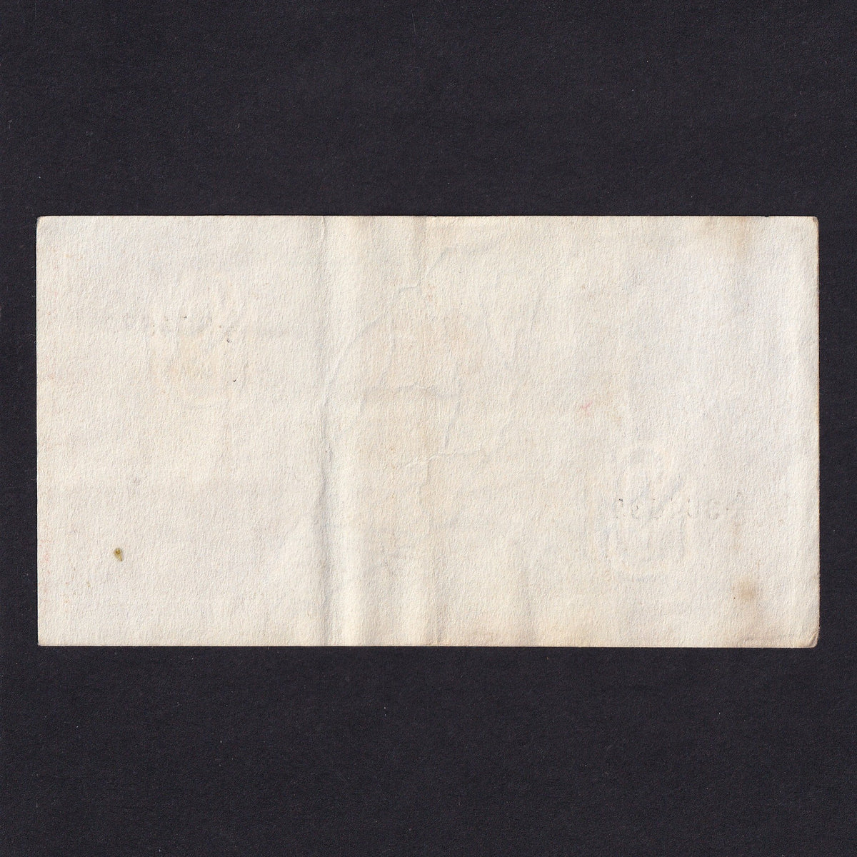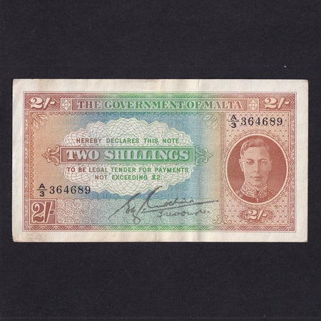 Malta (P17c) 2 Shillings, 1942, KGVI, A/3 but watermark of map of Malaya, rust, VF