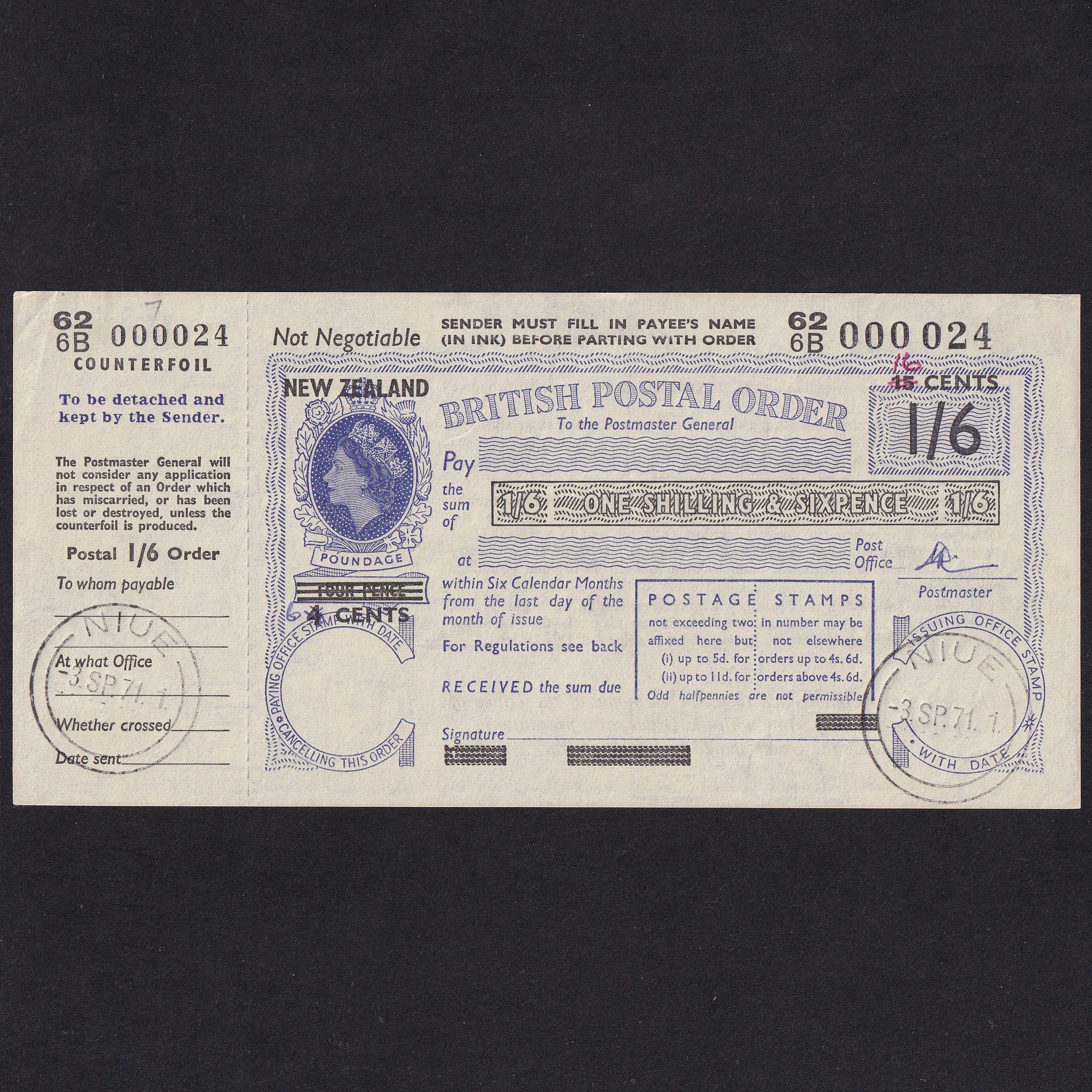 New Zealand, 1/6d Postal Order, 1971, 626B 000 0024, QEII, Good EF