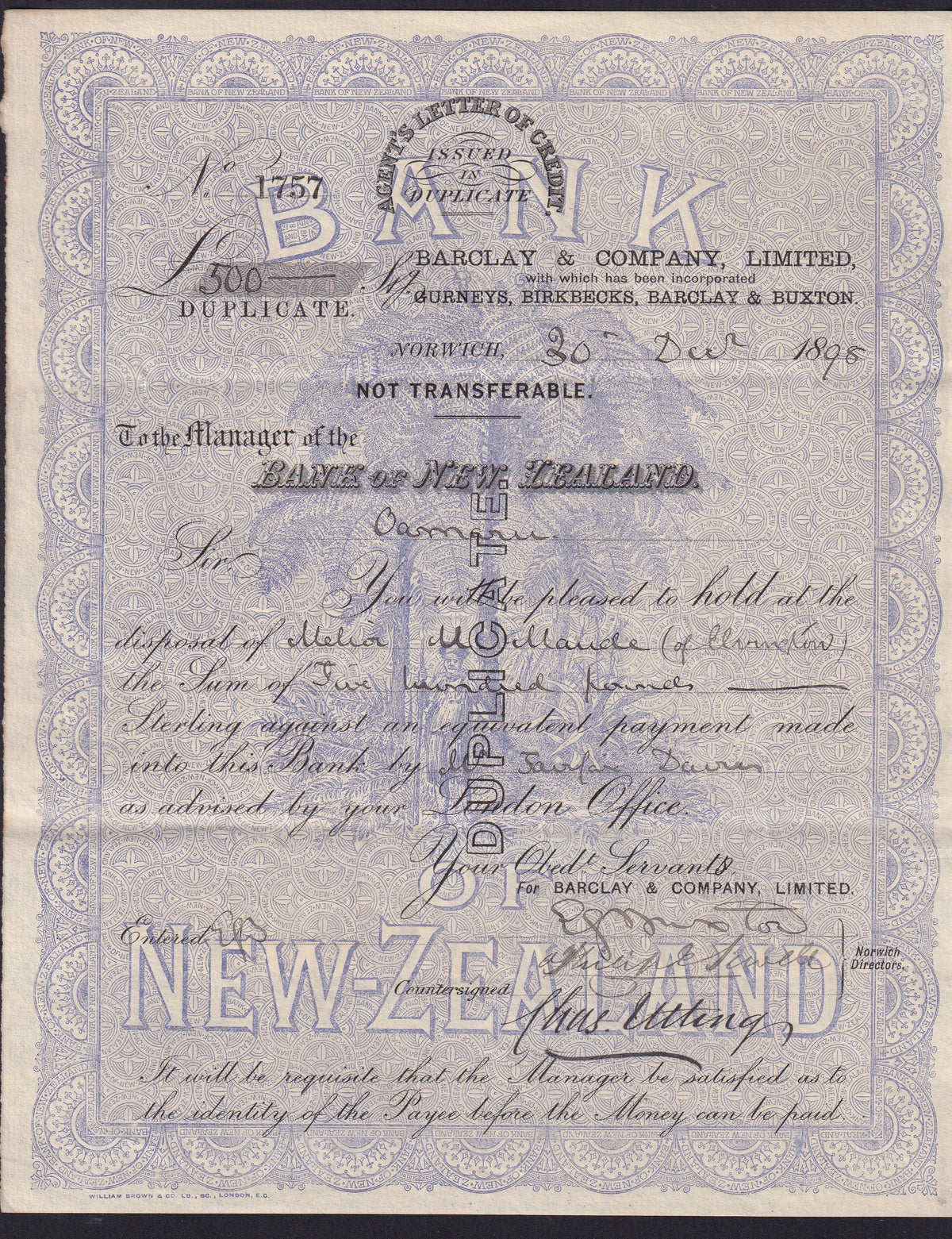 New Zealand, Bank of New Zealand, agents letter of credit £500, 1898, Fine