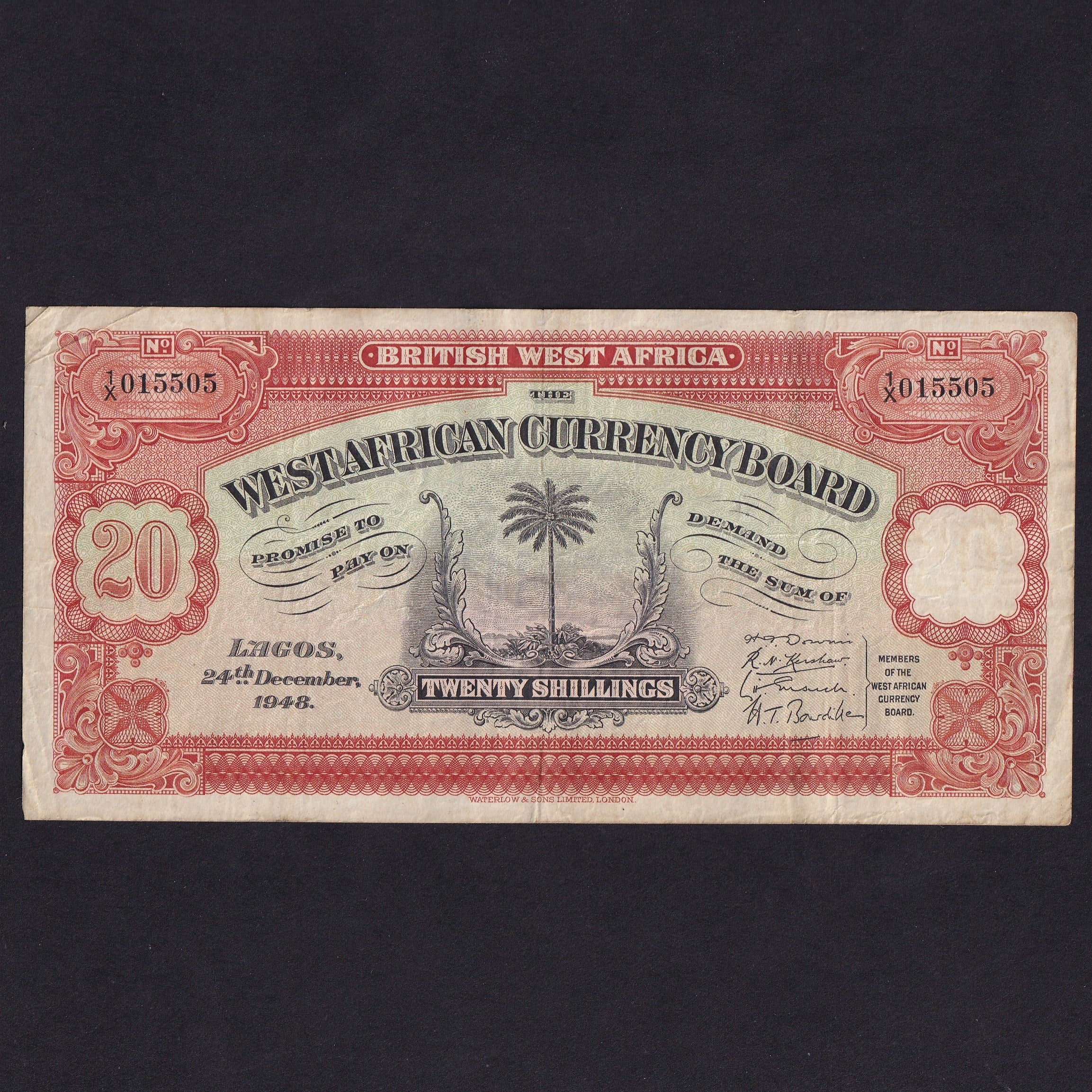 British West Africa (P8b) 20 Shillings, 24th December 1948, 1/X 015505, marks reverse, Good Fine