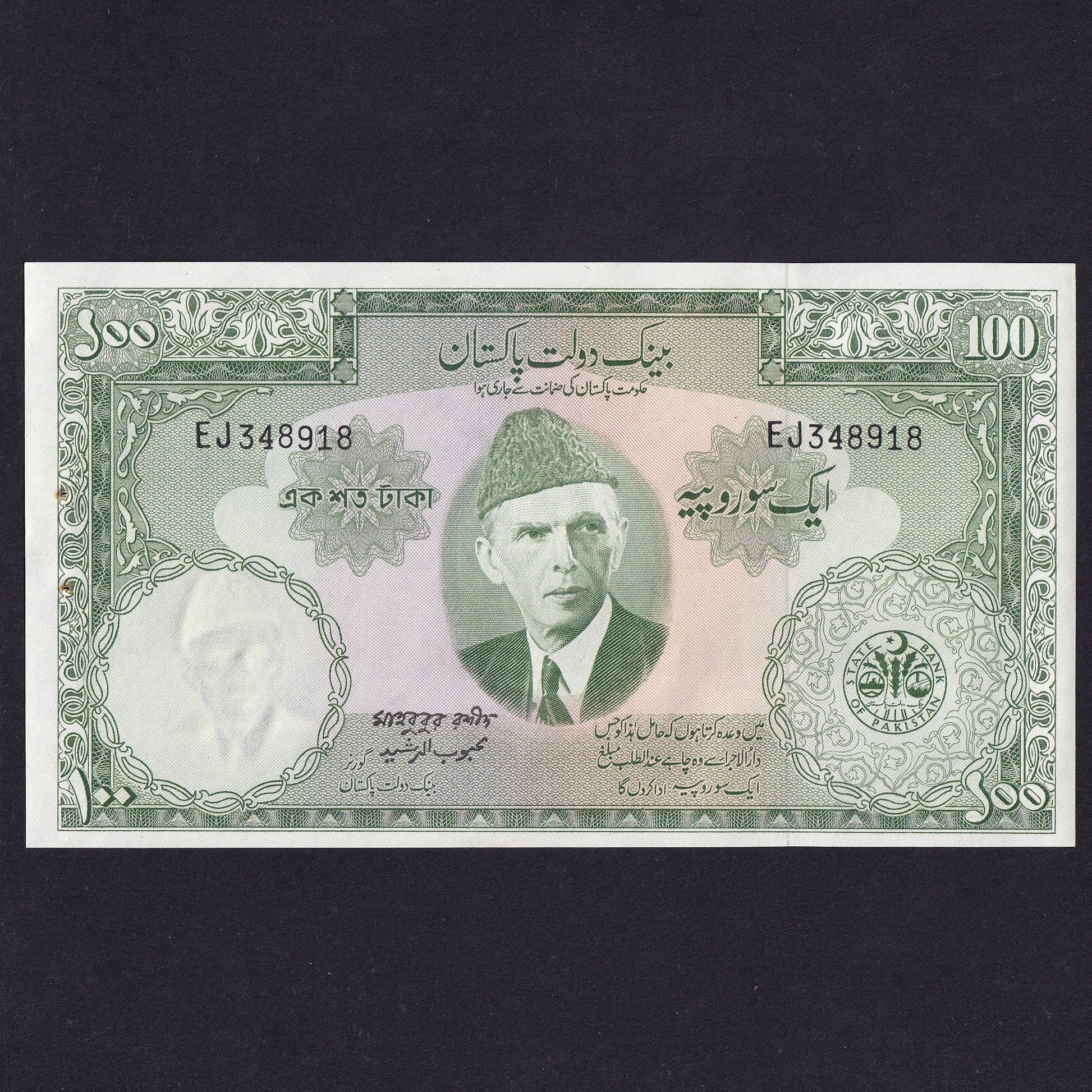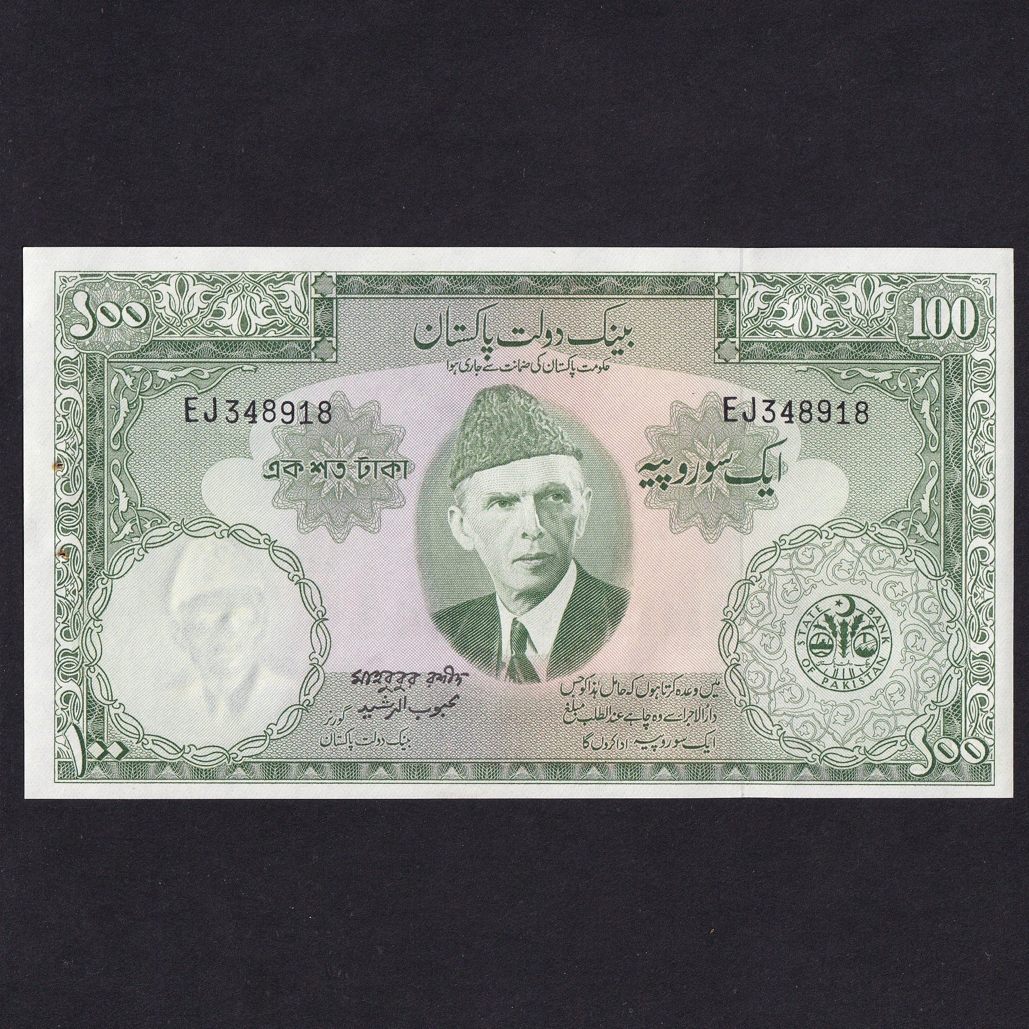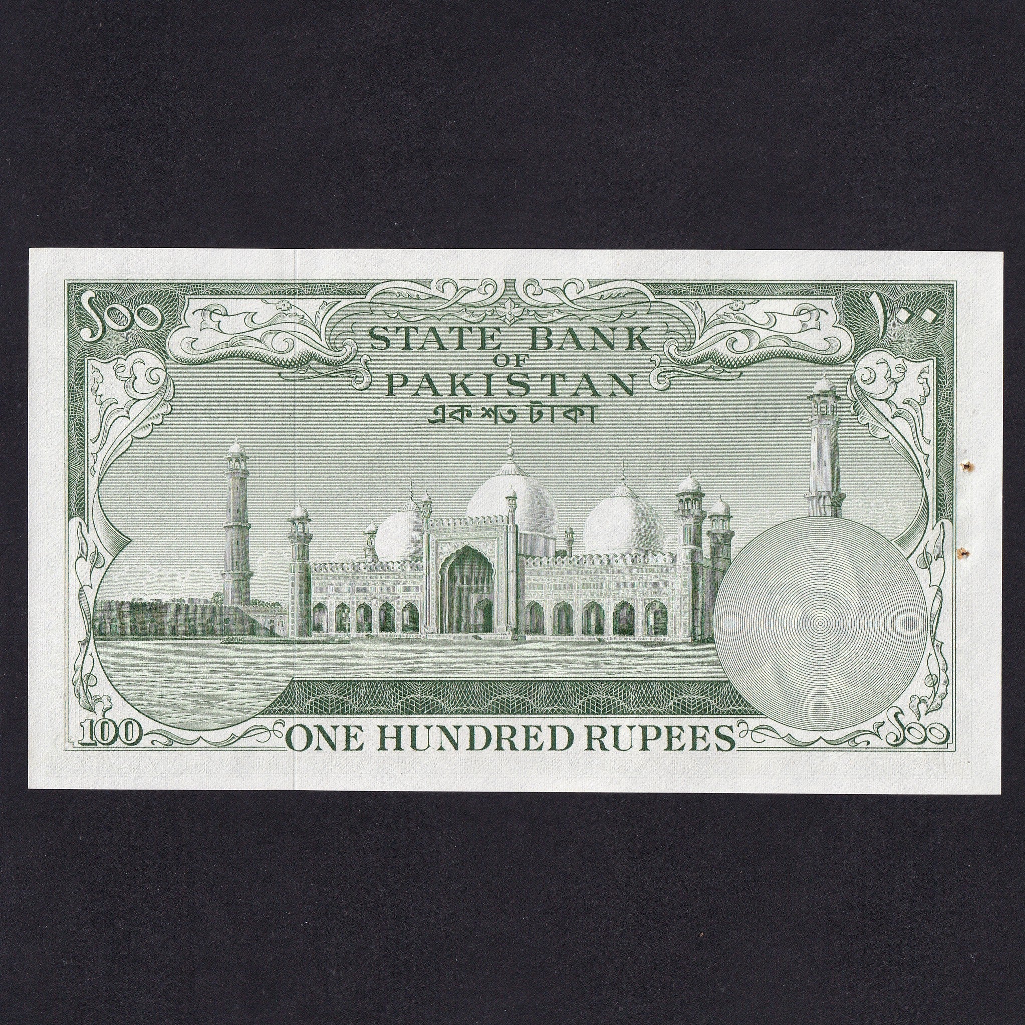 Decrease quantity for Pakistan (P18a) 100 Rupees, 1957, Jinnah, slight rust from staple hole, A/UNC