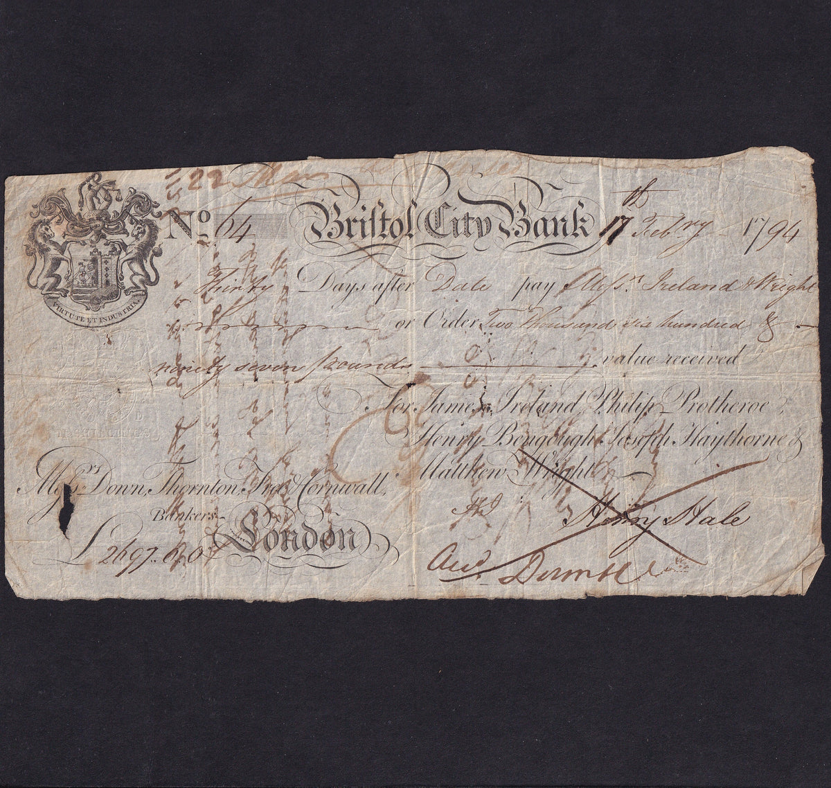 Provincial - Bristol City Bank, 30 days after sight £2697, 17th February 1794, partnership not seen, Outing 316, hole, otherwise Fine