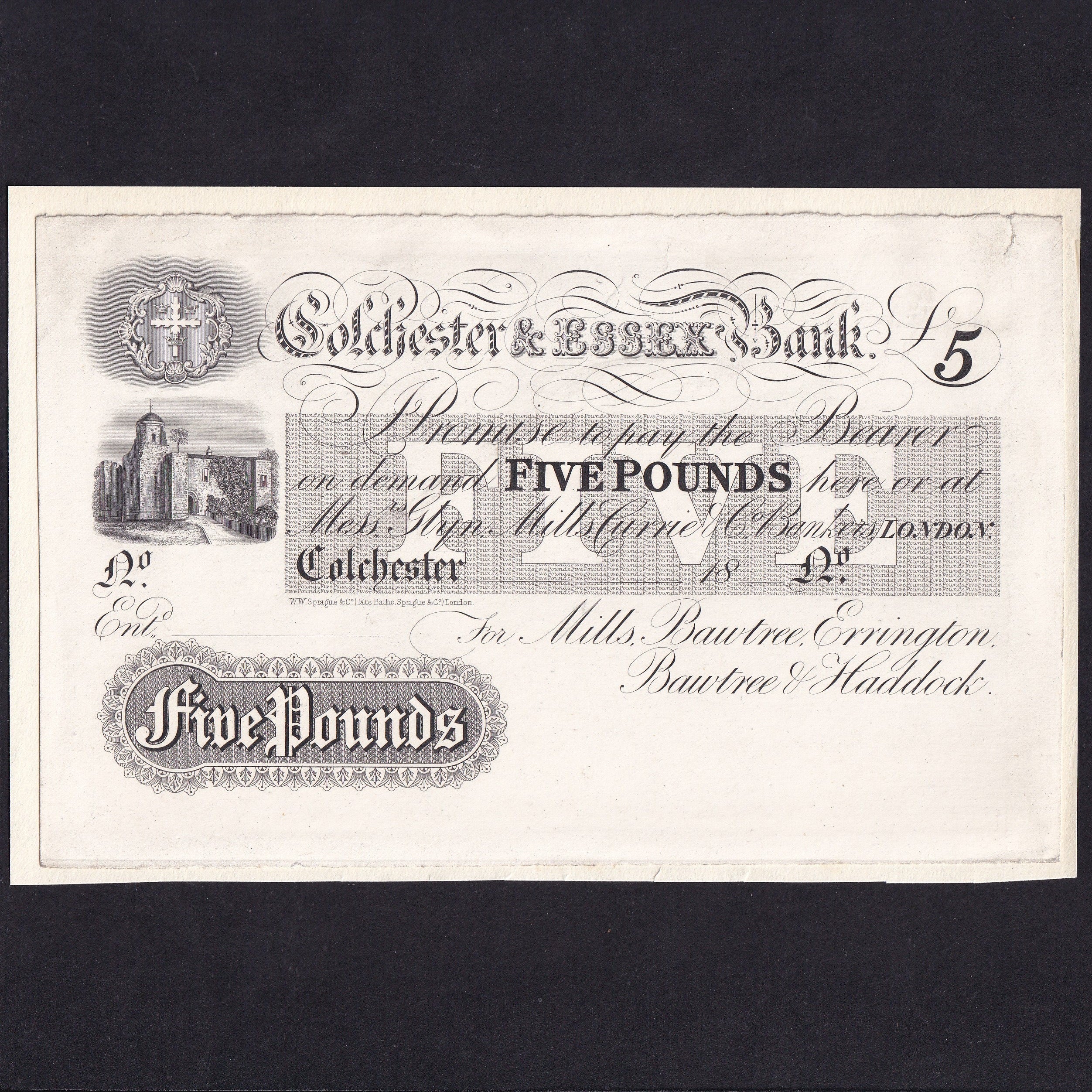 Provincial - Colchester & Essex Bank, £5 obverse proof, for Colchester branch, Outing 580 for type, mounted on card, EF