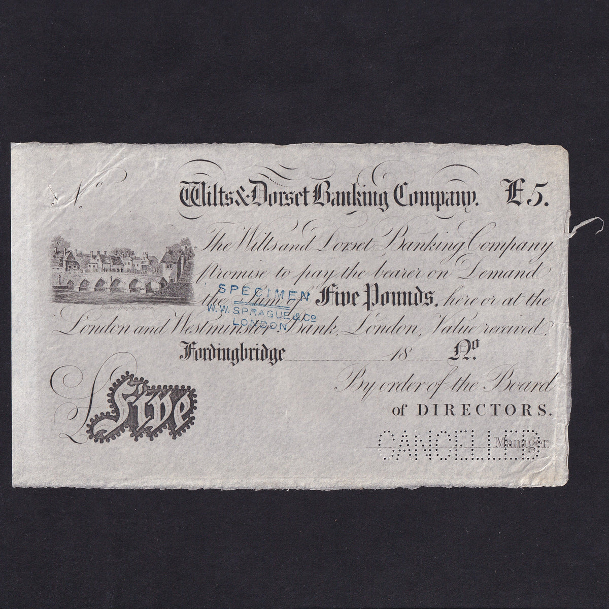 Provincial - Wilts & Dorset Banking Company, £5 specimen, 18xx, Fordingbridge, Outing 792a, EF