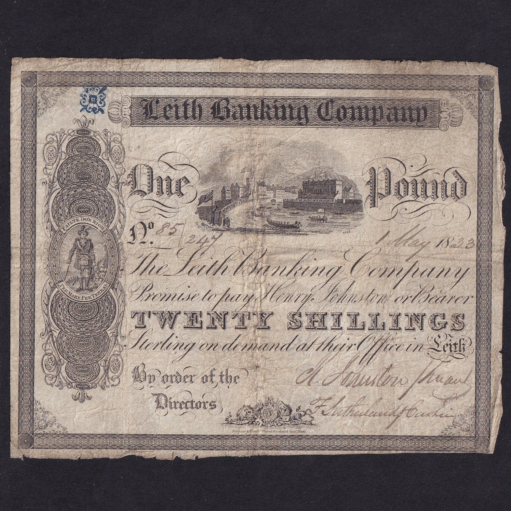Scotland, Leith Banking Company, 20 Shillings, pay Henry Johnston, 1st May 1833, first date, 85/247, blue flower control mark LB9c, Fine