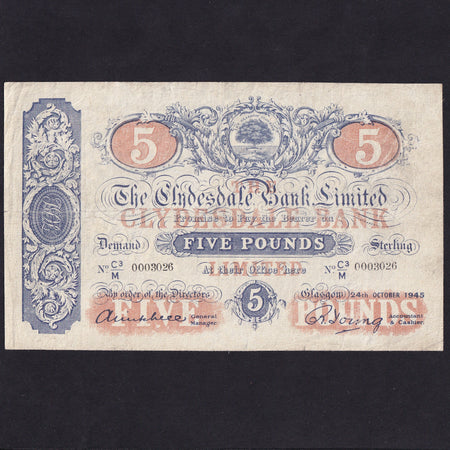 Scotland (P186) Clydesdale Bank Limited, £5, 24th October 1945, C3/M 0003026, horribly pressed, VG