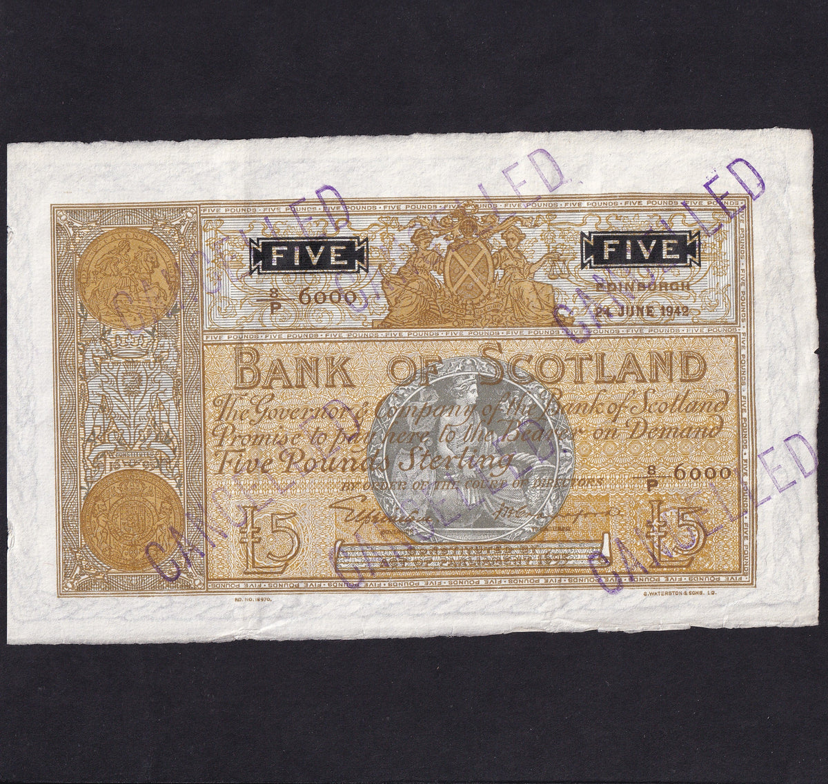 Scotland (P92c) Bank of Scotland, Elphinstone/Crawford £5 24th June 1942 Note 8/P 6000 cancelled for use as a specimen, Elphinstone/ Crawford, BA101c, Good VF