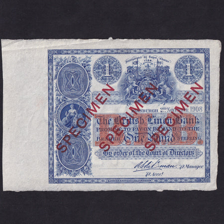 Scotland (P146) PMS BL54cs British Linen Bank, £1 specimen, 2nd November 1908, Alexander S. Aikman, BL49s, A/UNC