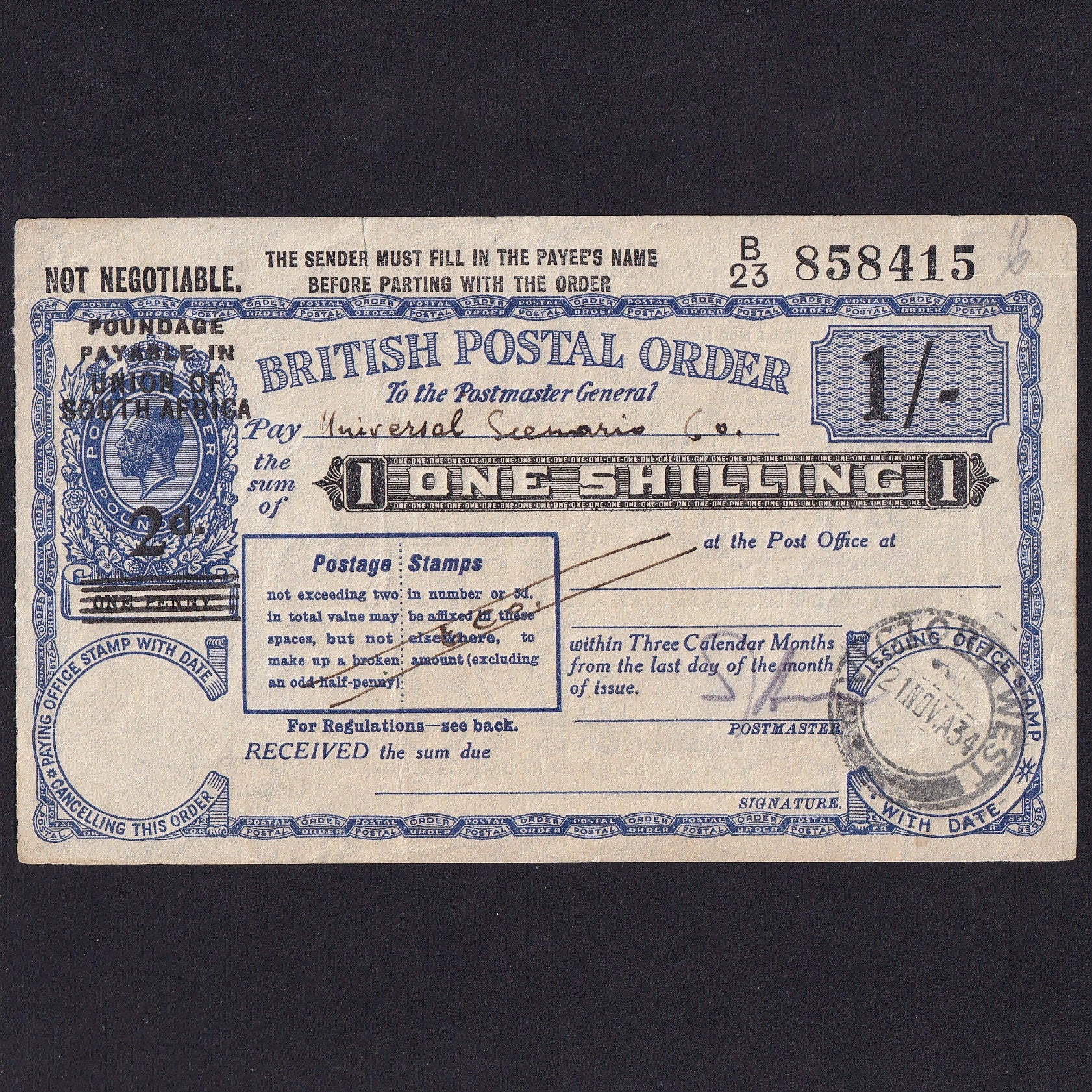 South Africa, 1/- Pence Postal Order, 1934, KGV, no. B23 858415, VF