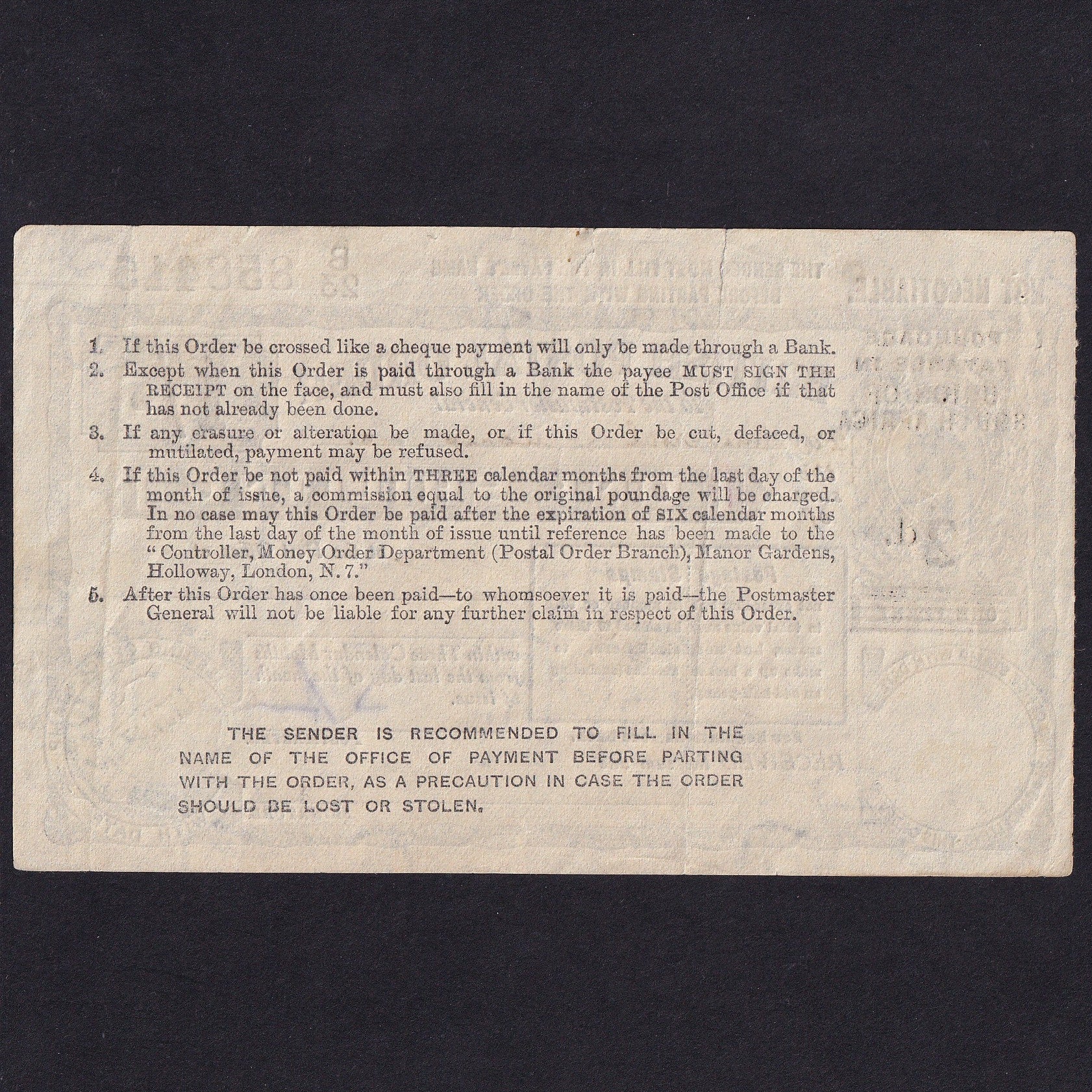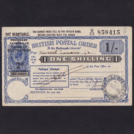 Increase quantity for South Africa, 1/- Pence Postal Order, 1934, KGV, no. B23 858415, VF