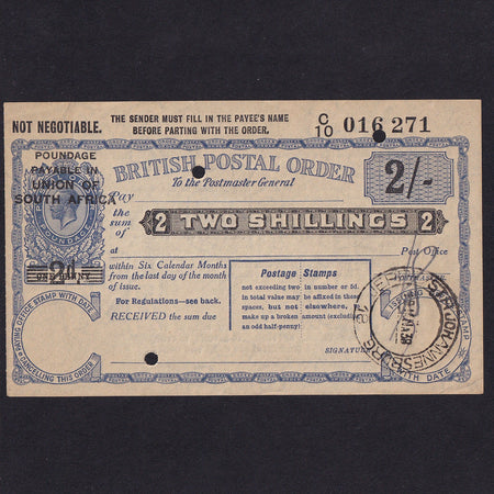 Increase quantity for South Africa, 2/- Pence Postal Order, 1938, KGV, no. C10 016 271, VF