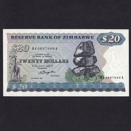 Zimbabwe (P.3a) $20, Salisbury 1980, signature 1 Crough, DA 009700A, UNC